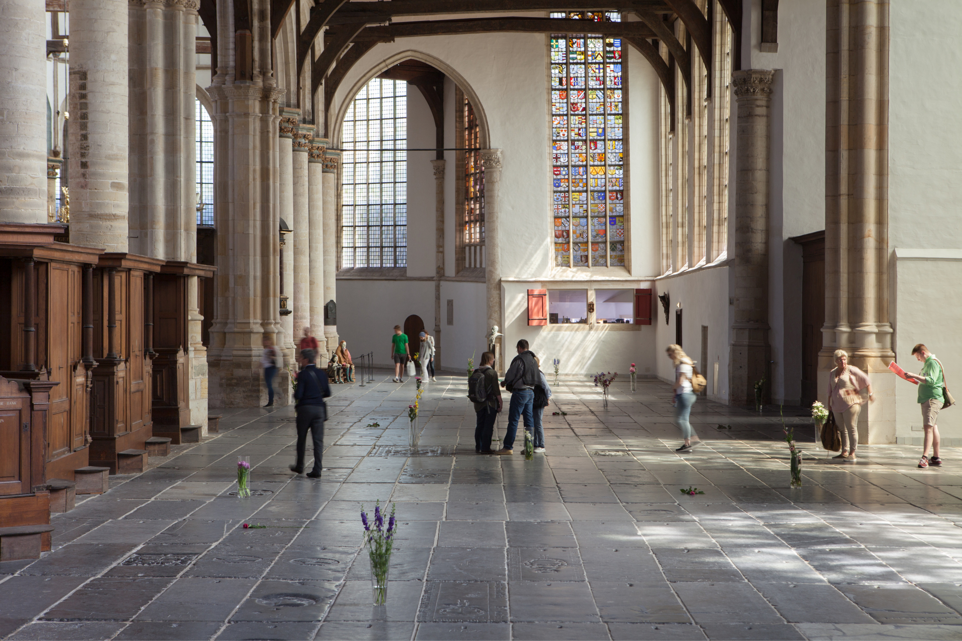 Job Koelewijn maakte 'Celebration (you only live once)(you only die once)': vazen met kleurrijke bloemen op de zerkenvloer om de duizenden doden te eren die in de loop der eeuwen in de kerk een laatste rustplaats vonden, op een tafel ligt een boek met hun namen zodat ze nu weer even uit de anonimiteit raken. Van Folkert de Jong zijn de oudere man en kind – zijn werk heet ‘Heritage’ en is gemaakt van styrofoam en purschuim – die bedrukt voor zich uitstaren. Waarover? We mogen het zelf invullen. Elders liggen twee grijze matglazen bustes van Michaël Borremans, met een eendensnavel als neus. De titel: ‘Everything Falls’.
