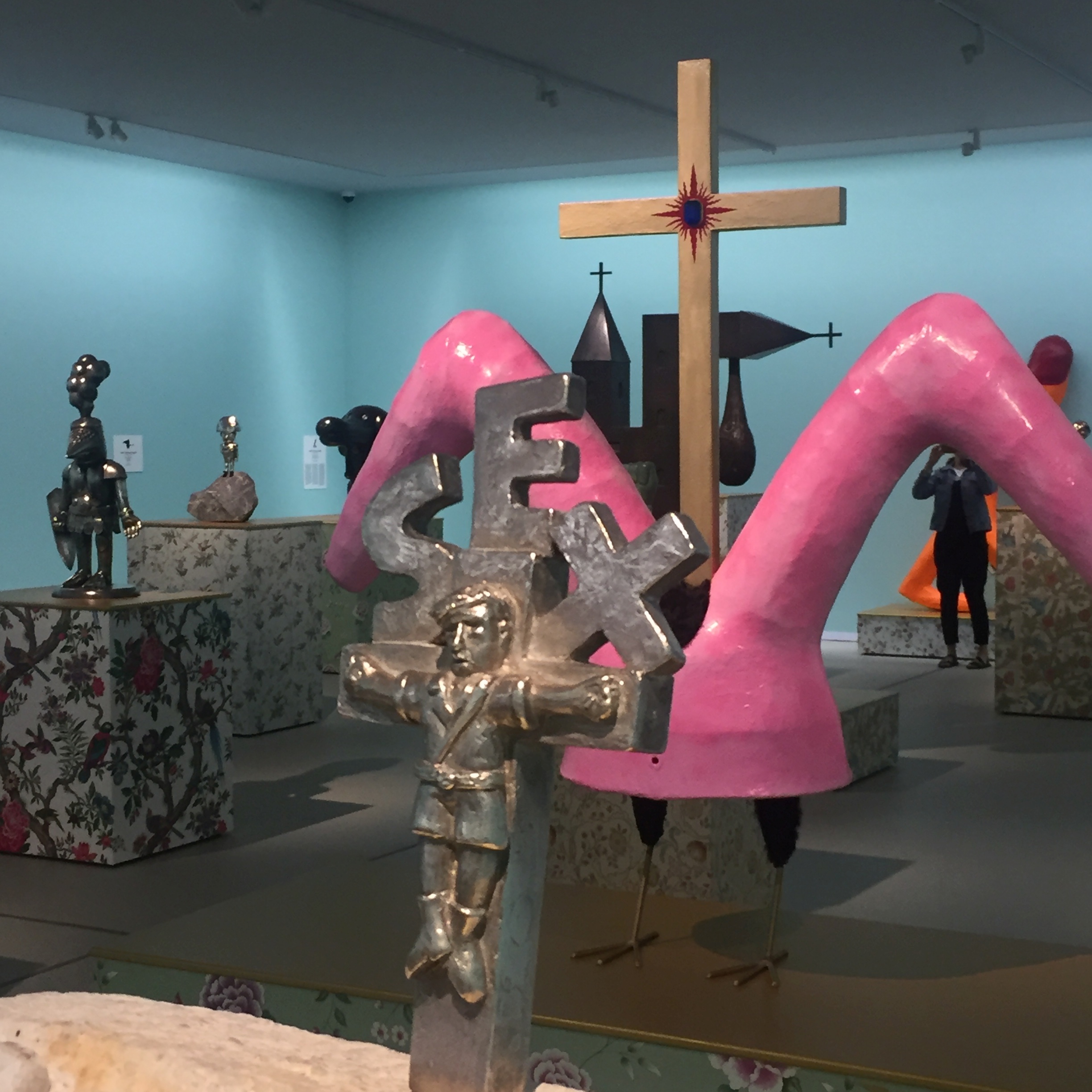 Joost van den Toorn, op de voorgrond: 'Something to believe in' (2013), daar achter: 'Heilige kip (1988), eigen foto, te zien in Groningen