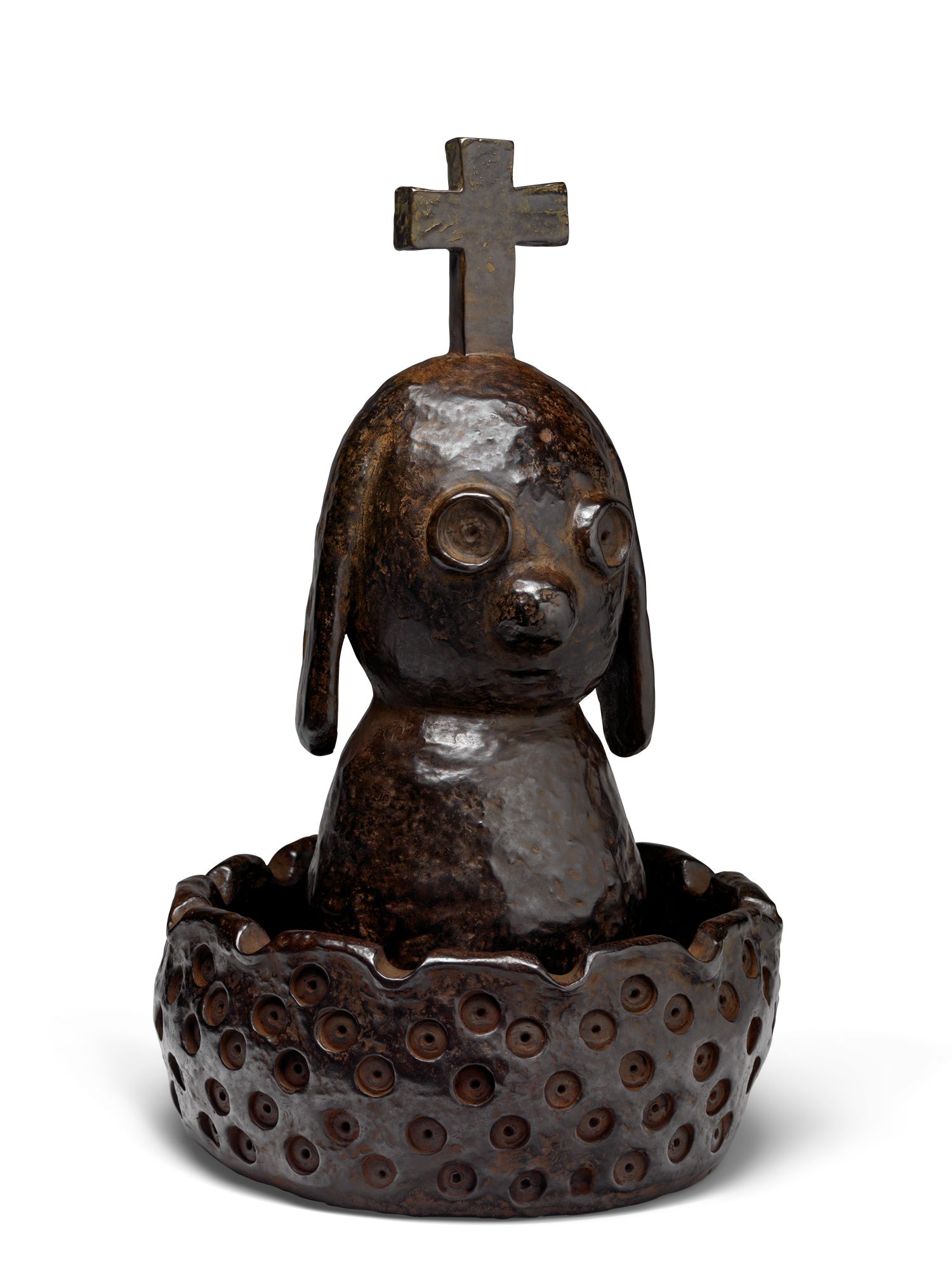 In ‘Last Supper Ashtray’ – uit 2014 - zit een hond met een kruis op zijn kop in een asbak. Waar kunnen we (nog) in geloven als we die sculptuur duiden? Schenk: ‘Jezus is in de loop der eeuwen door tal van dieren gesymboliseerd, onder andere door de vis, het lam, de pelikaan, en (….) ook door de mythische vogel Phoenix. Dus waarom niet ook door een puppy? Dieren zijn in het werk van Van den Toorn vaak brengers van vriendschap en troost.’