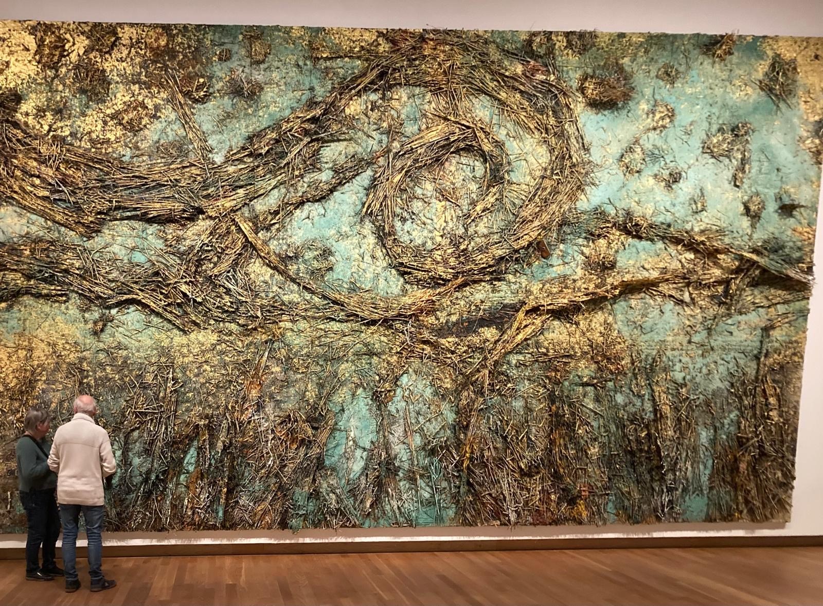 Geïnspireerd door Van Gogh, ja, we wisten het al en het klopt.. 'De Sterrennacht' van Kiefer dateert uit 2019. Zijn materialen: emulsie, olieverf, acrylverf, schellak, stro, bladgoud, hout, metaaldraad en bezinksel van elektrolyse op doek. Het gelaagde effect is verbluffend. Op het bordje: 'Kiefer is gefascineerd door de nachtelijke hemel, een mysterieus universum waar onze oorsprong ligt. Zijn 'De sterrennacht' verwijst naar de diepe verbinding tussen hemel en aarde.'