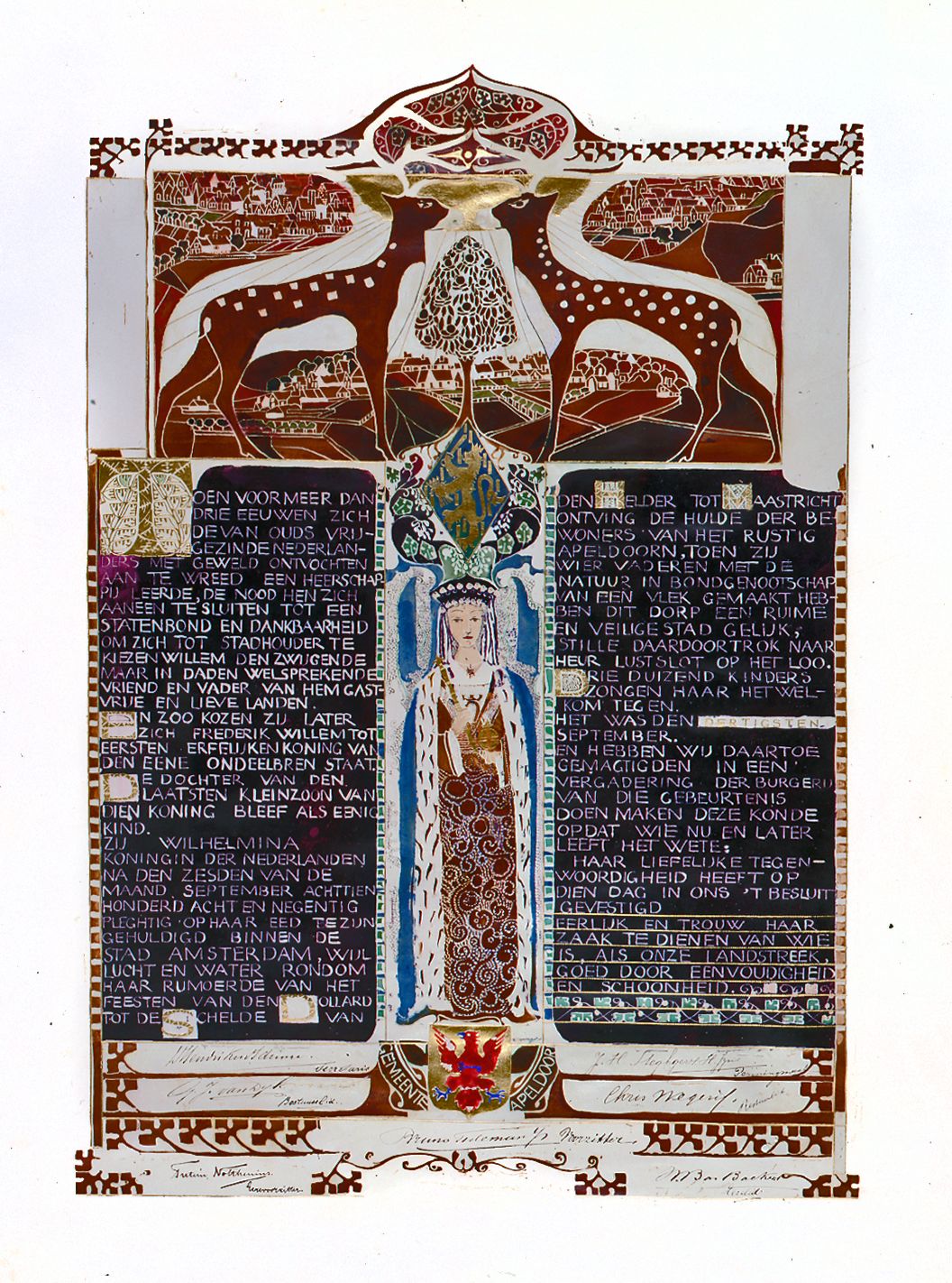 Gebatikte oorkonde door C.A. Lion Cachet, 1898, Koninklijke Verzamelingen, Den Haag. Aangeboden door bevolking Apeldoorn bij eerste bezoek aan Paleis Het Loo na inhuldigingsfeesten