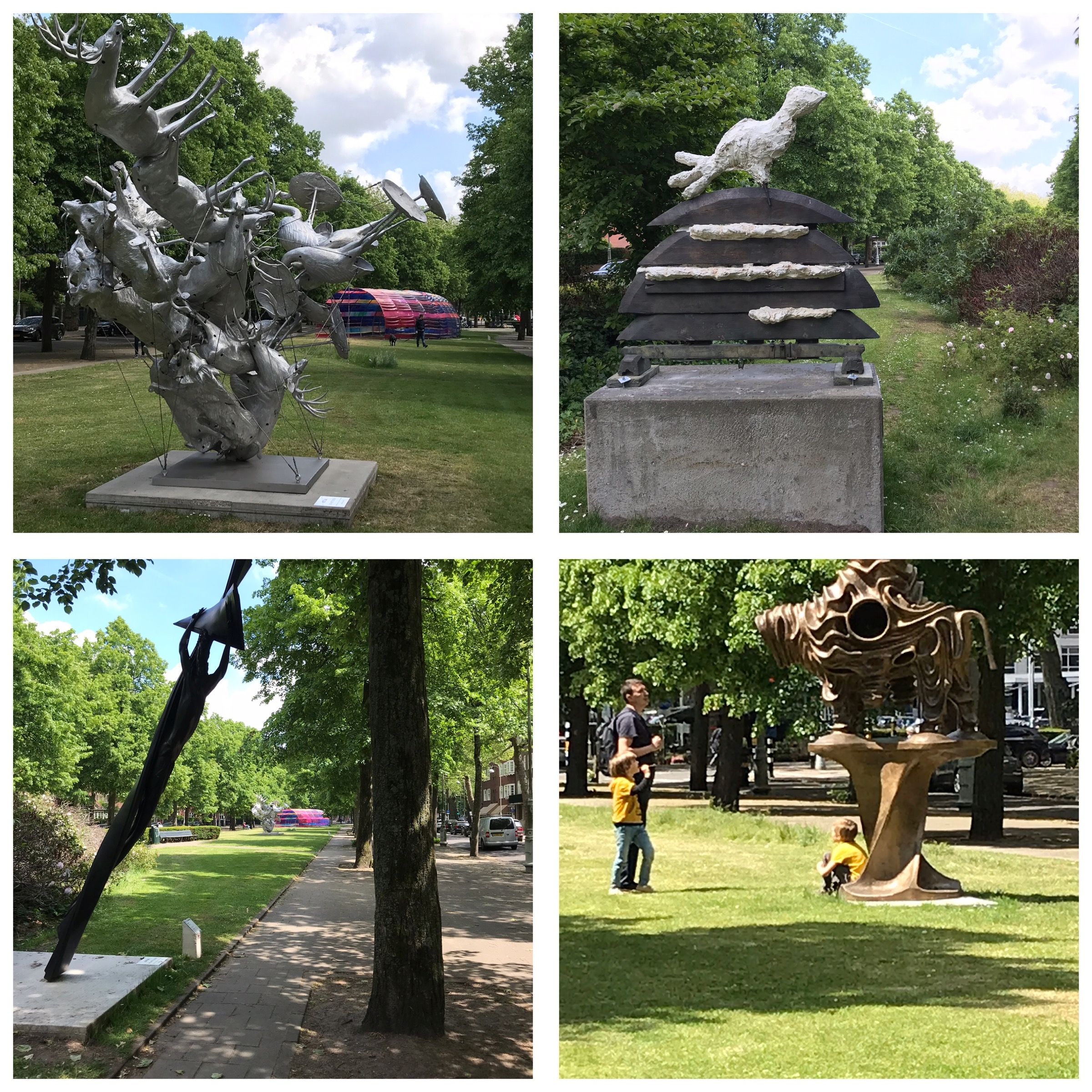 ARTZUID, impressie Apollolaan, eigen foto's. Links boven: Nancy Rubins: Agrifauna Delicata (2017); rechts boven: Karel Appel, Sitting Bird (1991); links onder: Wim Delvoy, Jesus Twisted (2006); rechts onder: Atelier Van Lieshout, The Leader (2015 en later)