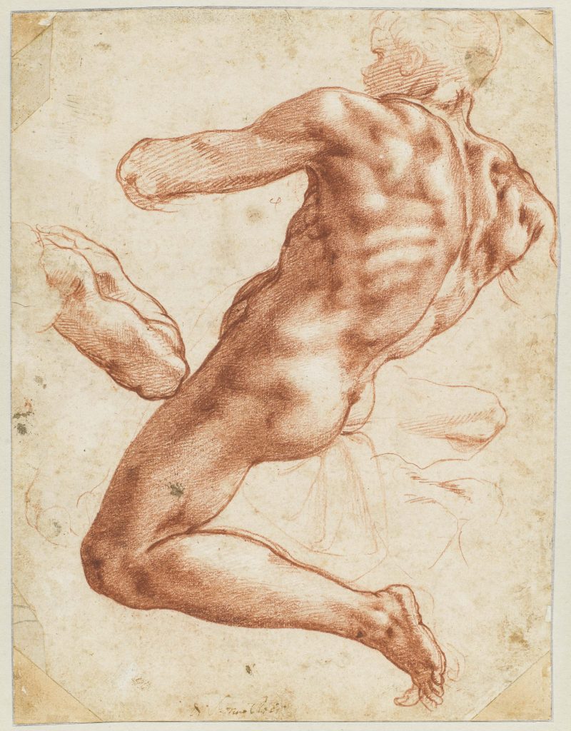 Waarom zien de vrouwen die Michelangelo (1475-1564) verbeeldde er zo mannelijk uit? In het Teylers Museum opent deze week de expositie 'De mannen van Michelangelo', een expositie van 22 tekeningen van zijn hand uit de eigen collectie en veertig bruiklenen. Michelangelo's grote kennis van anatomie en zijn favoriete gebruik van gespierde mannelijke modellen worden gedetailleerd belicht maar ook de theoretische en religieuze betekenis die de diepgelovige kunstenaar - hij viel op jonge mannen - aan het mannenlichaam hechtte. In de Renaissance werd het mannelijk lichaam als de ultieme schepping van God gezien.