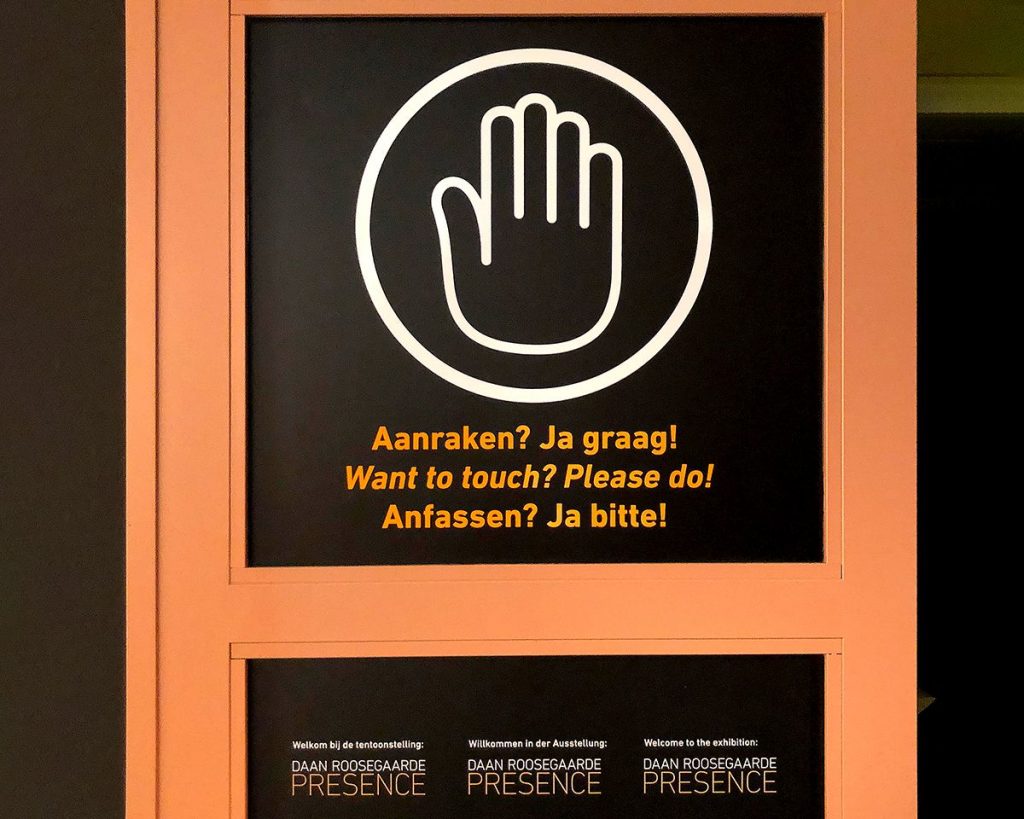 *Kunstenaar en innovator Daan Roosegaarde ontwikkelde speciaal voor het Groninger Museum een groot nieuw interactief kunstwerk: Presence. De tentoonstelling heet Presence met een reden: de aanwezigheid van bezoekers is noodzakelijk. Je zou spitsvondig kunnen zeggen dat geen enkele tentoonstelling eigenlijk bestaat als niemand er naar komt kijken. Maar voor Presence is aanwezigheid – en het handelen van de bezoeker essentieel: Zonder dat zou er niet veel te zien zijn. Voelen, aanraken en bewegen zijn essentieel om het werk te co-creëren. Aan het begin van de tentoonstelling staat dan ook prominent een nieuw, door Roosegaarde ontwikkeld pictogram: Aanraken? Graag!