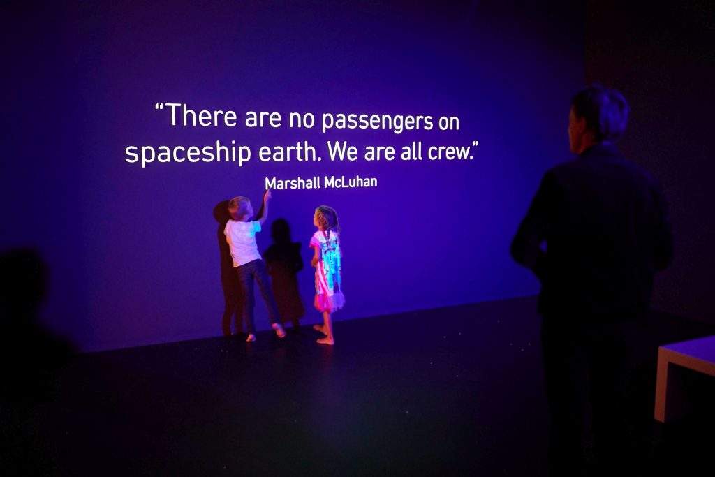 Team Roosegaarde – de kunstenaar heeft uiteraard een heel team om zich heen en werkt samen met zeer diverse partners – begeeft zich op het gebied van kunst, geavanceerde technologie, energie, architectuur, esthetiek, engagement en deze opsomming is vast niet volledig. Er lijkt weinig waar de sympathieke en goed van de tongriem gesneden kunstenaar zijn licht níet over kan laten schijnen. In Presence is technologie ondergeschikt aan het spelplezier van de gebruiker. Er zijn geen teksten waarin wordt ingegaan op de gebruikte technologie – en dat is natuurlijk een bewuste keuze. Je hoeft de technologie achter het werk niet te kennen om er van te genieten. Maar het gaat Roosgaarde niet alleen om het spelen met licht, lichaam, bollen en blokken. Roosegaarde wil de toeschouwer veranderen. Het is alle hens aan dek om de milieuproblemen waarmee de mensheid kampt, aan te pakken. In de laatste zaal staat dan ook prominent een citaat van de Canadese filosoof Marshall McLuhan: