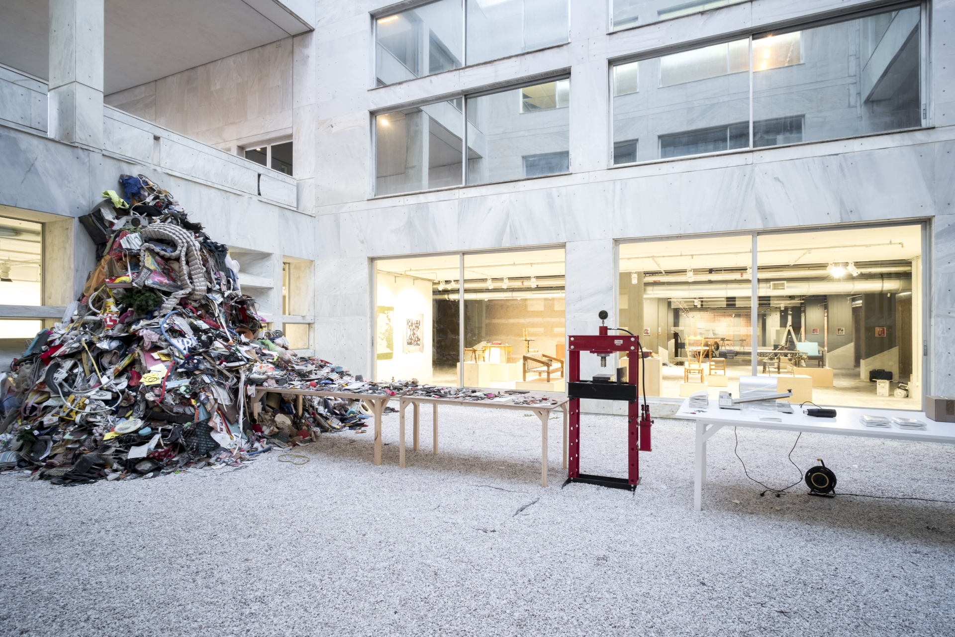 Dan is het Odeion (of conservatorium), verder aan de Vasileos Konstantinous een meer dichtbezette plek: vooral op de benedenverdieping zijn er mooie muzikale installaties van onder meer Lala Rukh, korte films, en maakt Daniel Knorr (Boekarest 1968) met een schroothoop-machine kleine boekjes door allerlei rommel en rotzooi tussen de bladen te persen met een boekpers: iedereen die er acht euro voor over heeft en zo'n twintig minuten wachten kan een uniek eigen Daniel Knorrboek mee naar huis nemen.