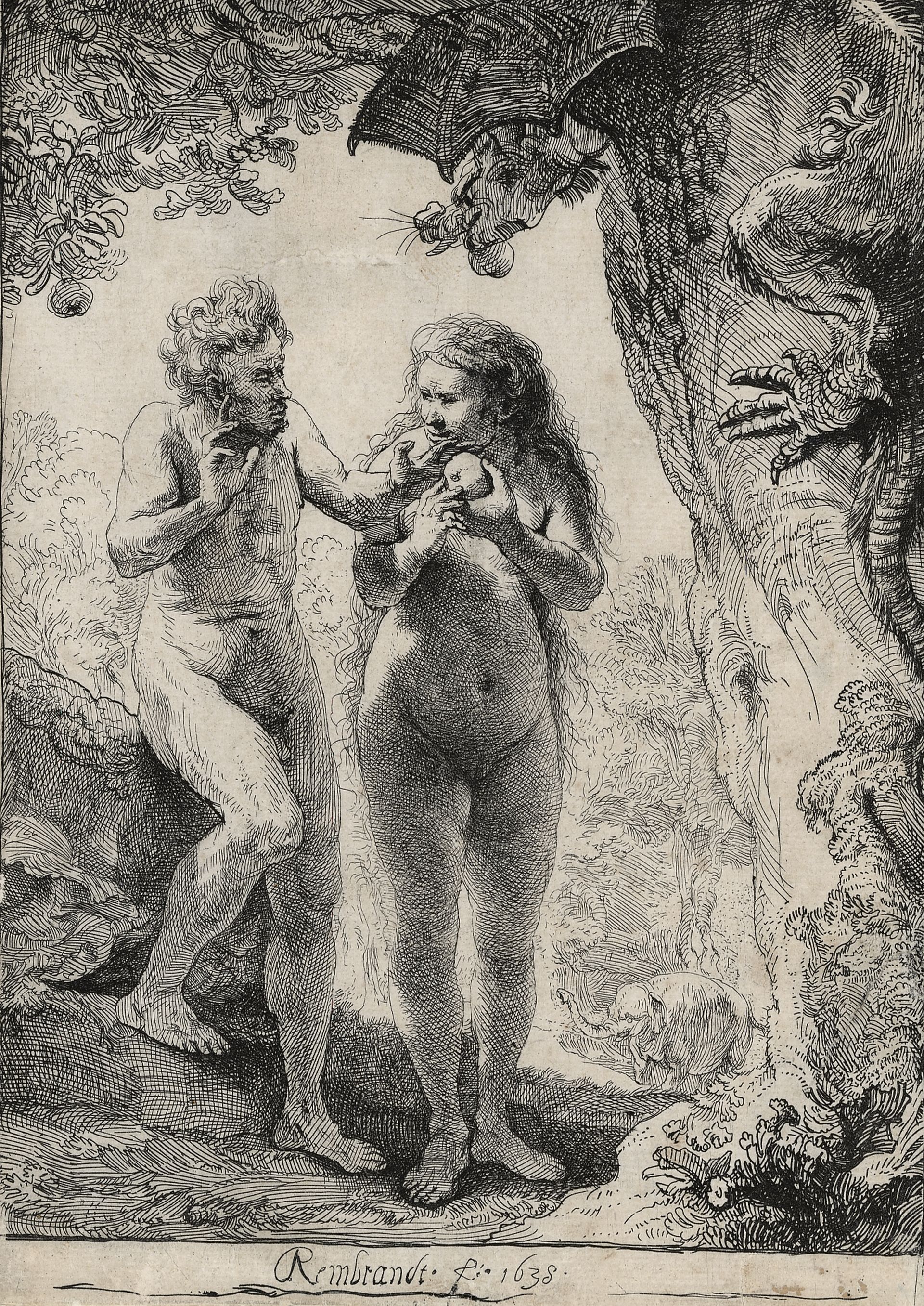 Rembrandt, Adam en Eva in het paradijs, 1638, ets, Rijksmuseum Amsterdam, met rechts onder in de verte een olifant