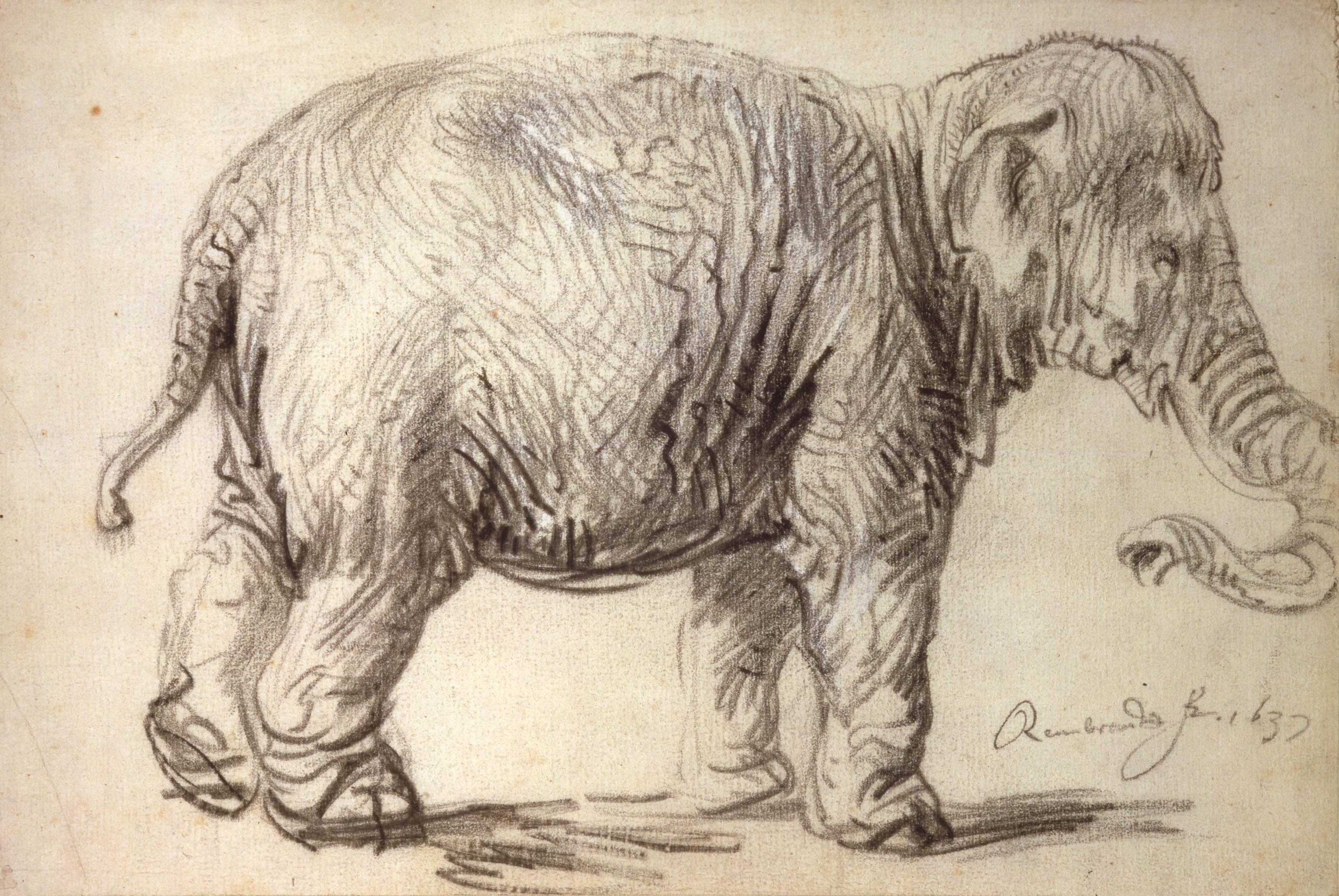Rembrandts tekeningen van Hansken zijn gemaakt in zwart krijt met donkere contourlijnen en schaduwpartijen van houtskool. Hij tekende haar ‘nae ’t leven’, met liefdevolle aandacht voor de donzige haartjes op kop en staart. Uit die haartjes blijkt dat ze nog jong was. Rembrandt was een verwoed verzamelaar van exotische artefacten. Hij had diverse opgezette dieren in zijn kunstkamer, zoals een opgezette paradijsvogel en een komodovaraan. Maar een levende of dode olifant had hij nog nooit in het echt gezien. Die kans benutte hij op de Amsterdamse Botermarkt toen Hansken haar kunstjes kwam vertonen op de jaarmarkt. Aan die kunstjes, ze kon er wel 36, had hij een broertje dood. Hij was juist geïnteresseerd in haar exotische verschijning, de intrigerende geplooide huid, die droevige blik en de alsmaar zwaaiende slurf en staart. Rembrandt ondertekende zijn tekening voluit met jaartal, iets wat hij nooit deed bij studieschetsen. Niet veel later zou hij haar als vrolijk, klein olifantje laten figureren in zijn beroemde ets van Adam en Eva in het Paradijs. Op de expositie flankeren de twee beroemde tekeningen van Hansken uit de Albertina (Wenen) de ets van Adam en Eva. Rembrandt voegde Hansken als actueel fenomeen toe aan het Bijbelse verhaal van de Zondeval, zodat deze prent extra aantrekkelijk werd voor kopers.