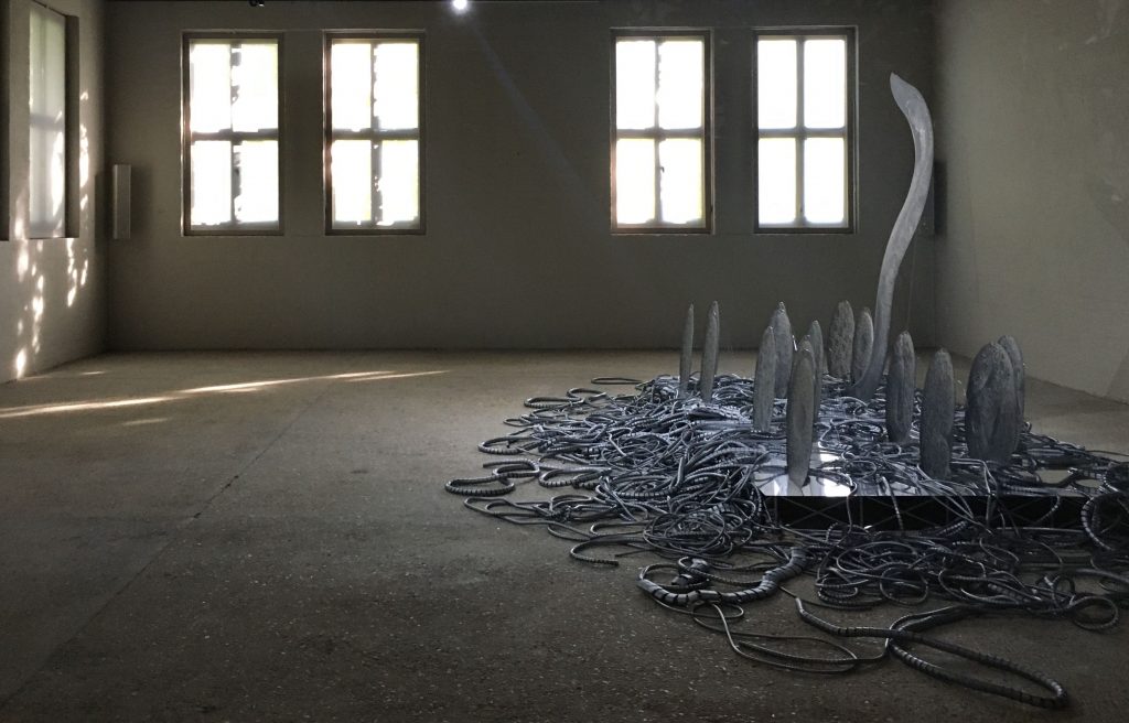 Isabelle Andriessen maakt in ‘Tidall Spill’ werken waarbij levenloze materie levende eigenschappen krijgen, waarbij ze allerlei chemische processen laat zien. Materialen die groeien, zweten, lekken, kristalliseren, reageren en parasiteren. Zij maakt korte metten met het hele idee van bestendigheid dat een sculptuur doorgaans oproept. Haar sculpturen zweten, stollen, groeien, zweten, lekken, druipen, kristalliseren, reageren en parasiteren. Als de ene sculptuur een chemische substantie afscheidt, beginnen andere te roesten en te kristalliseren. Op de keramische huid van haar werken tekenen zich koorts, tumoren en zweren af, alsof ze zijn geïnfecteerd met een virus. Andriessen noemt deze werken zelf ‘zombie-sculpturen’, vanwege de manier waarop hun mensachtige metabolisme de grenzen aftast van wat leeft en niet leeft.