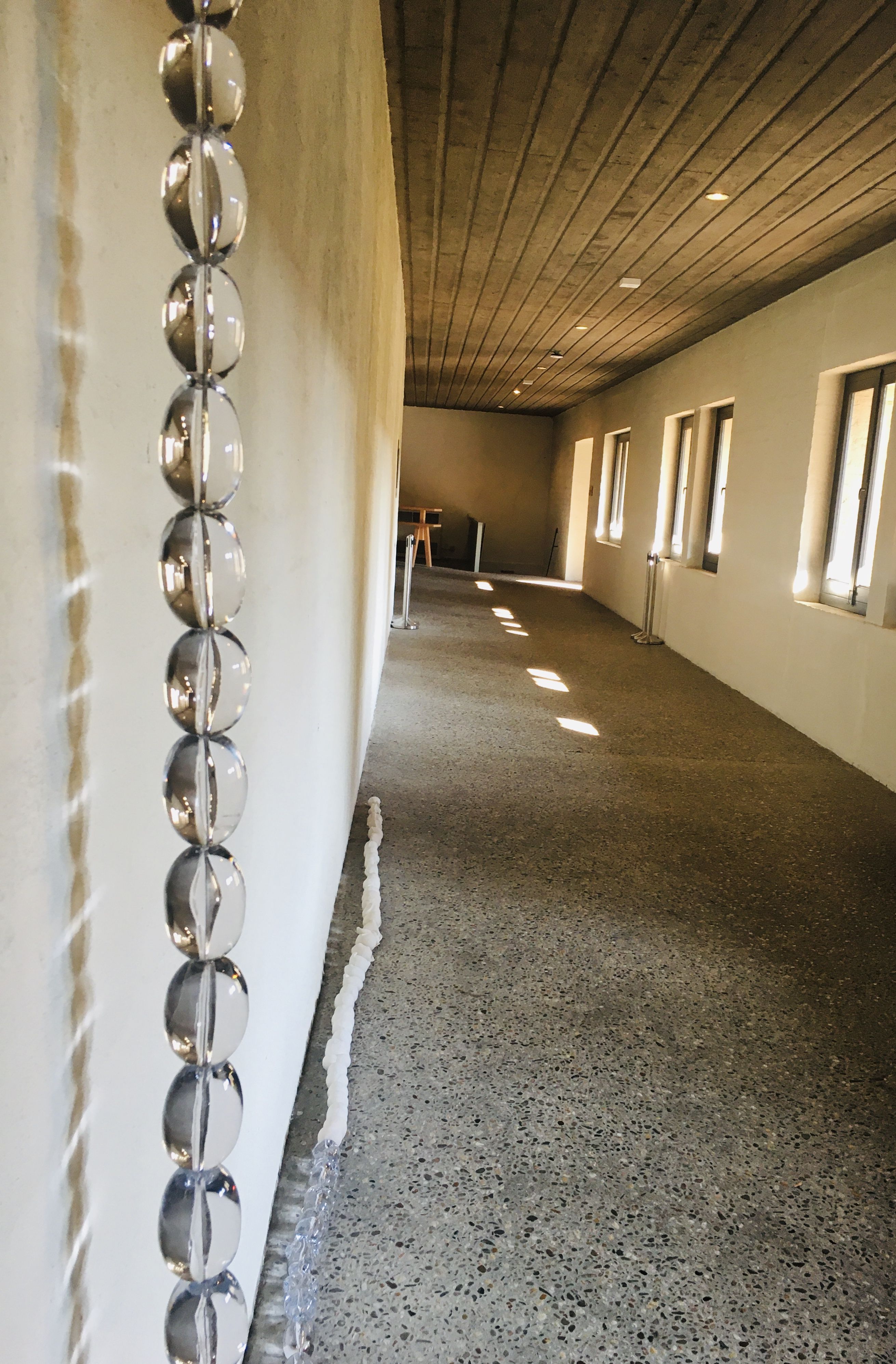 Ook mooi verstild is een meterslang snoer met grote glazen en porseleinen kralen van de Utrechtse kunstenaar Temra Pavlovic. Voor een deel hangt het verticaal, voor een deel ligt het op de vloer. Elke kraal staat voor een tijdsinterval. Afgeronde stukjes leven, zou je kunnen denken. Het buitenlicht uit de binnentuin in de kloostergang zorgt voor een prachtige licht- en schaduwwerking.