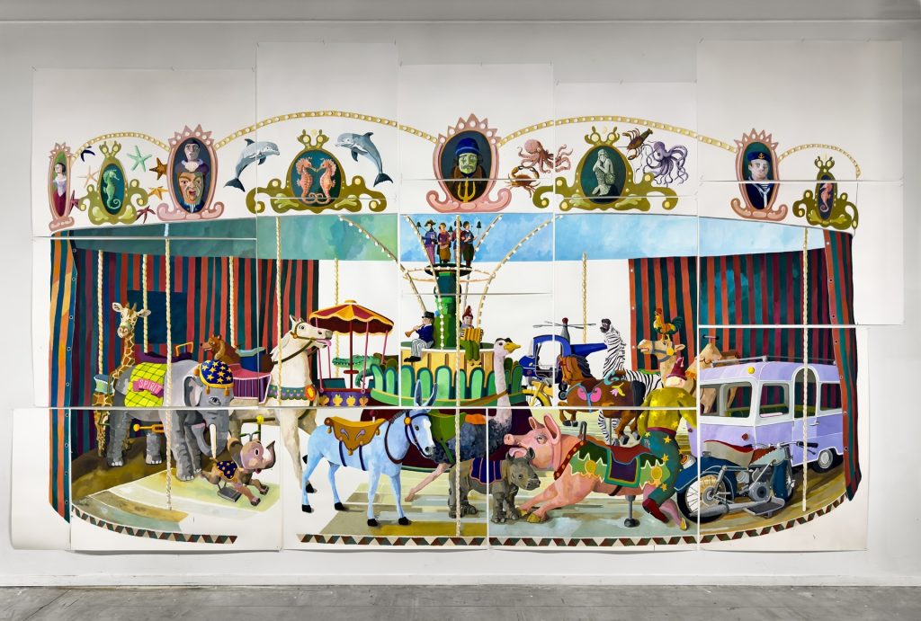 In welke sferen belanden we op de expositie Merrily, merrily, merrily, merrily in Museum More waar Erik Mattijssen (1957) zijn 25-jarig kunstenaarschap viert? Een kinderwereld in elk geval, zie de ruimte waar een jong publiek - vermoed je - net weg is na een poppenkastvoorstelling, er is nog niet opgeruimd. Mattijssen maakte een nieuw werk voor dit jubileum, al even vrolijk stemmend. 'Winterstalling'is een monumentale draaimolen van bijna vier meter hoog en zeven meter breed met feestattributen in aanlokkelijke kleuren. Zonder mensen, die zijn er niet op zijn werk, we mogen ze er zelf bij denken.