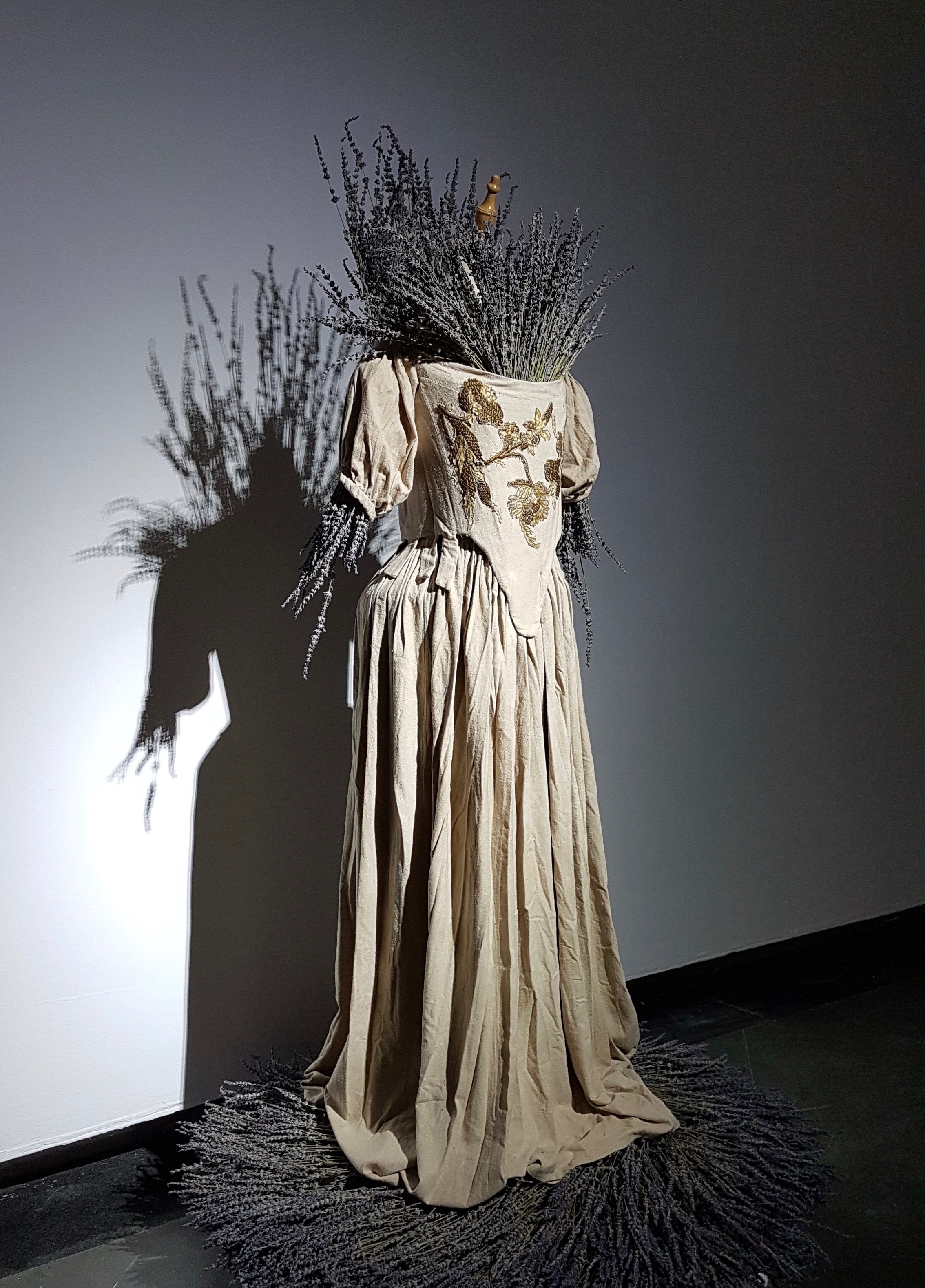 Plague Dress, Anna Dumitriu, zonder jaartal, hedendaags, handgekleurd met walnootschillen, vroeger dacht men dat die de pest konden genezen. Ism. National Collection of Type Cultures