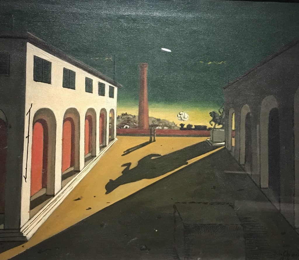 In deze tentoonstelling wordt het werk van De Chirico (44 schilderijen) steeds gepresenteerd naast dat van de drie Belgische surrealisten. De prachtige schilderijen van de lege Italiaanse pleinen uit de beginperiode van De Chirico zijn helaas in de minderheid. Meer is er te zien van willekeurig in landschappen geplaatste meubels en schilderijen. Van de Belgische evenknieën is steeds gerelateerd werk te zien. Paul Delvaux schilderde zijn hele leven al vrouwen, treinen, architectuur, antieke beelden en skeletten, maar nadat hij in 1943 het werk van De Chirico zag, kregen zijn schilderijen een dromerige laag. Hij was vooral geïntrigeerd door De Chirico's desolate pleinen en straten.