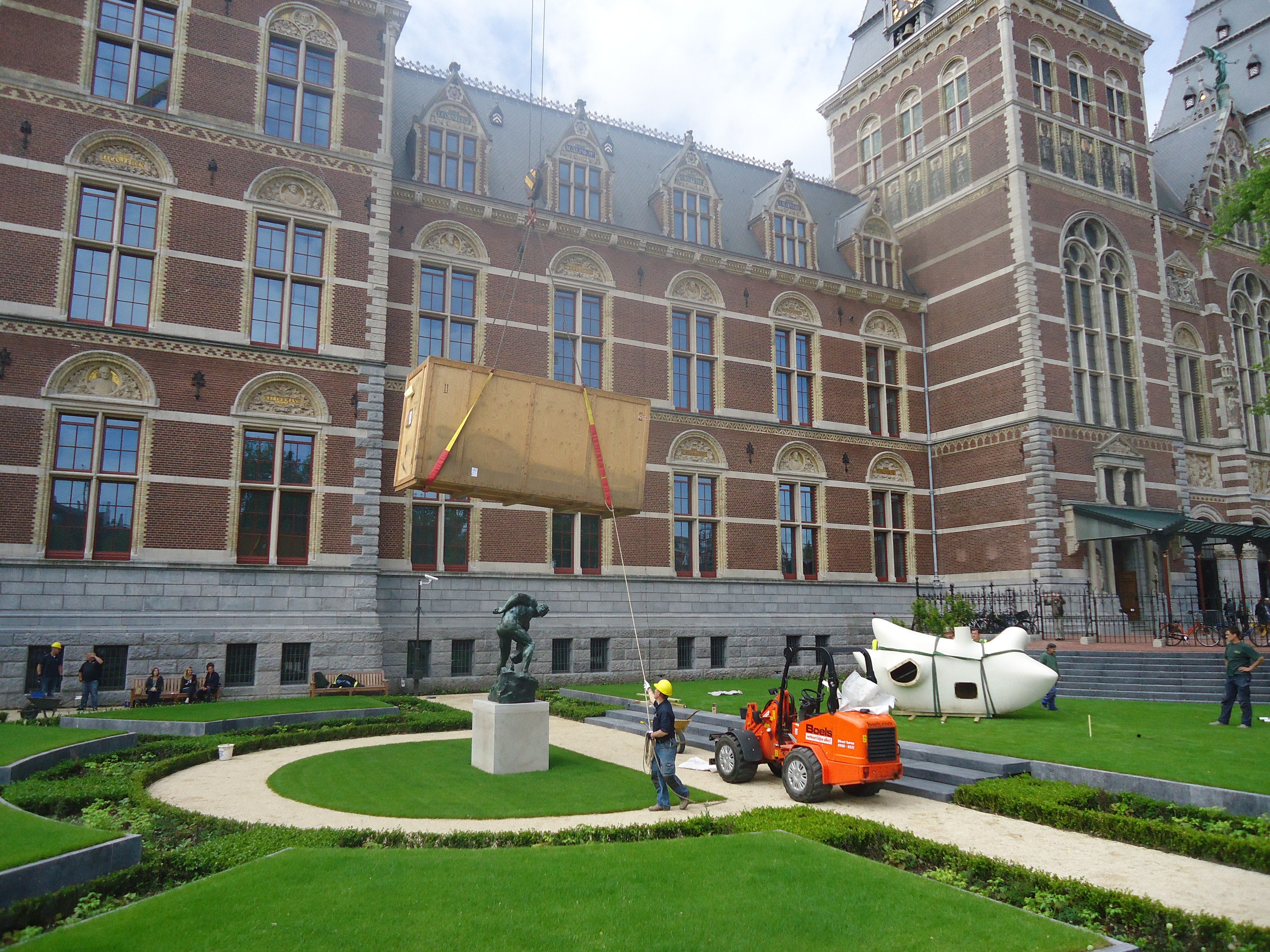 * De tuinen van het Rijksmuseum worden op zaterdag 22 juni opengesteld voor het publiek met een tentoonstelling van veertien werken van de grote Britse beeldhouwer Henry Moore. Het grootste beeld arriveerde vandaag per speciaal transport uit Engeland. Large Reclining Figure uit 1983, een liggende vrouwenfiguur van wit fiberglas, is negen meter lang en weegt 2000 kilo. Voorafgaand aan het transport werd het beeld in vier delen gedemonteerd en in kisten verpakt. Er stond een hijskraan klaar op de Hobbemakade om de kisten in de linkervoortuin van het Rijksmuseum te tillen. Specialisten van het Rijksmuseum en de Henry Moore Foundation zetten het beeld weer zorgvuldig in elkaar, een klus die het grootste deel van de dag in beslag nam. In de tuin aan de Museumplein-zijde zijn intussen ook andere beelden van Moore neergezet. Een fototoestel past er met gemak door de spijlen van het hek en de beelden zijn zo monumentaal dat er ook vóór de officiële opening veel te genieten valt van het meesterschap van Henry Moore. Voor meer informatie: www.rijksmuseum.nl.