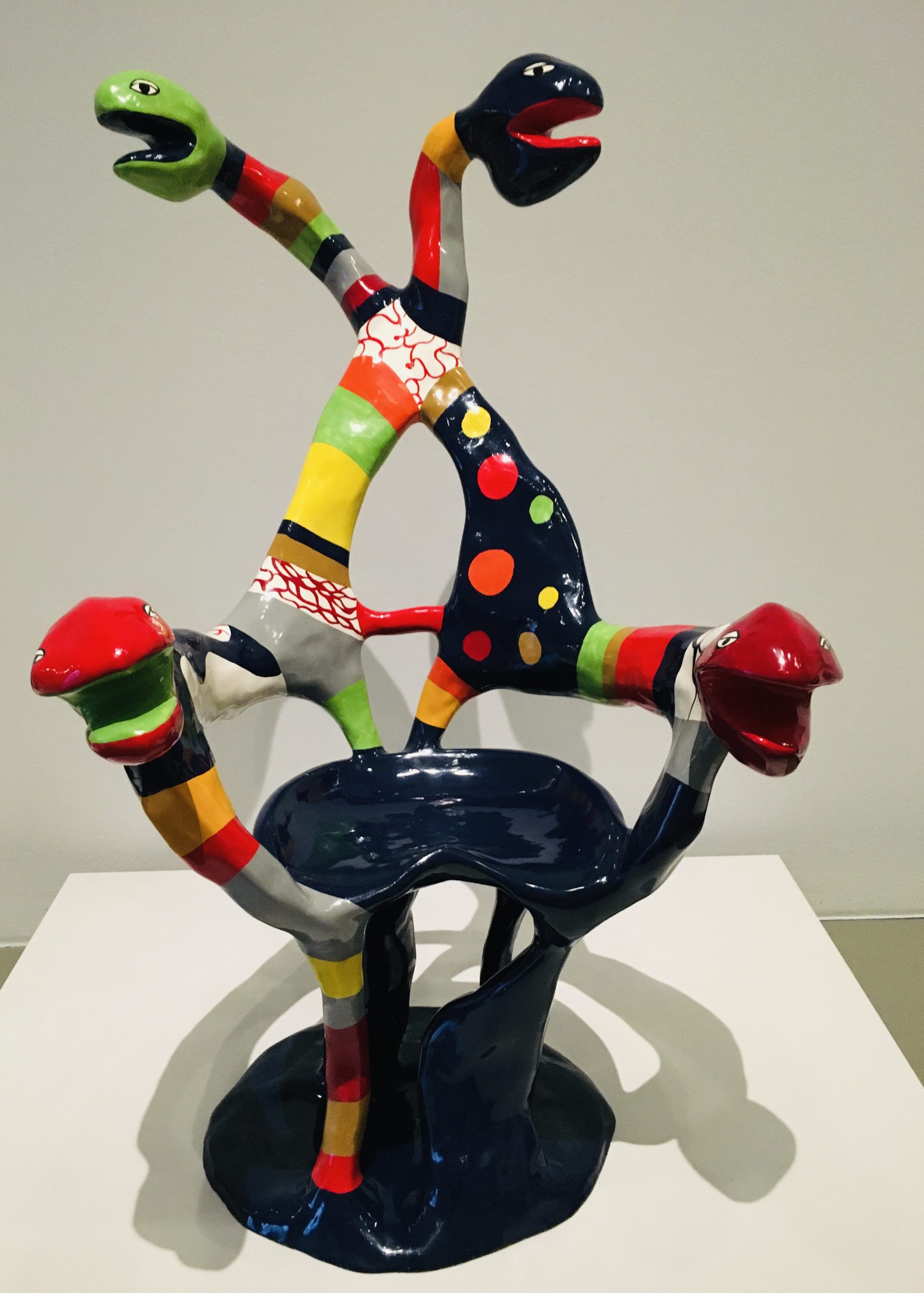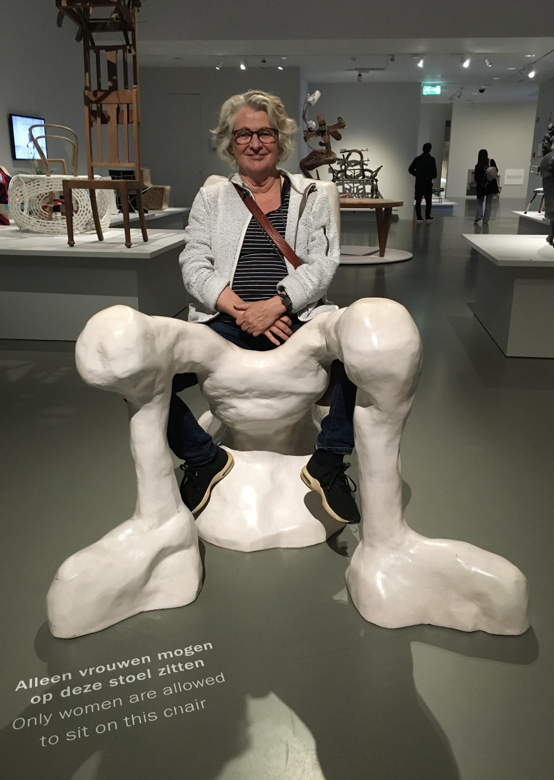 Bij ‘Stoelen als Boodschapper’ is de eye catcher ‘A Basic Instinct’ (2018) van de Deense kunstenares Anna Aagaard Jensen waar vrouwelijke bezoekers in mogen zitten om te ervaren hoe het is om net zo wijdbeens te zitten als mannen dat vaak doen , met name in het OV. Het vergt nogal wat klauterwerk om er in te gaan zitten. Ik vraag een passerende jonge vrouw of ze mij even op de foto wil zetten en dat doet ze uitgebreid en consciëntieus. Zij heeft er ook al in gezeten, vertelt ze, en vond het ook heel naar. En mannen die zo wijdbeens naast je zitten in een bus of trein: ook heel naar. Vooral als ze hun bovenbeen tegen het jouwe aanduwen. En dat je dan niets zegt. Ja, knik ik. Haar vriend staat er wat naast te zwijgen. De boodschap is wel doorgekomen.