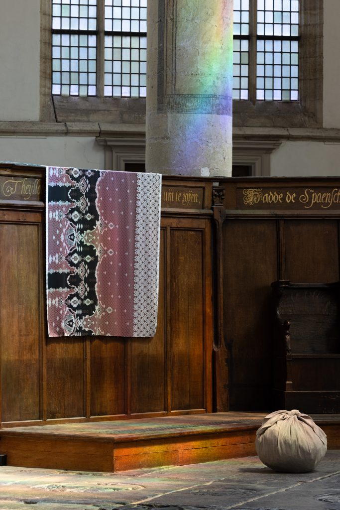 In dit opzicht is er in de stilte van de kerk nog meer te ontdekken. Her en der in de ruimte, op een speelse wijze verdeeld, legde Kimsooja even grote ronde bundels gekleurd textiel op de vloer. Het is haar hype als kunstenares. Hier kreeg het niet alleen haar typische verwijzing naar betekenissen van vertrek, reis of zelfs migratie. Al koos Kimsooja hiervoor met opzet stoffen die ze bij de diverse bevolkingsgroepen in ‘Mokum’ uit vele streken van de wereld heeft gevonden. Elke bundelbal lijkt enkelvoudig neergezet. Maar hun kleuren gaan relaties aan met de omringende kleuren van de grijze vloer, de witte pilaar, de houten koorstoelen en de roestkleurige wenteltrap. Zo ‘nestelt’ zich een bundelbal eventjes toch in de locatie, ook al zal die weer ergens heengaan. Rondom de koorwanden hangen bovendien tapijten of lappen uit, als of voor eventjes. Ze zijn er duidelijk niet als blijvende installatie gedacht. Weer lijken hun kleuren subtiel uitverkoren om zich tot die van nabije andere van de kerk te verhouden: bijvoorbeeld naast zwarte borden voor mededelingen aan pilaren of met die van het donkerbruine hout van het koor.