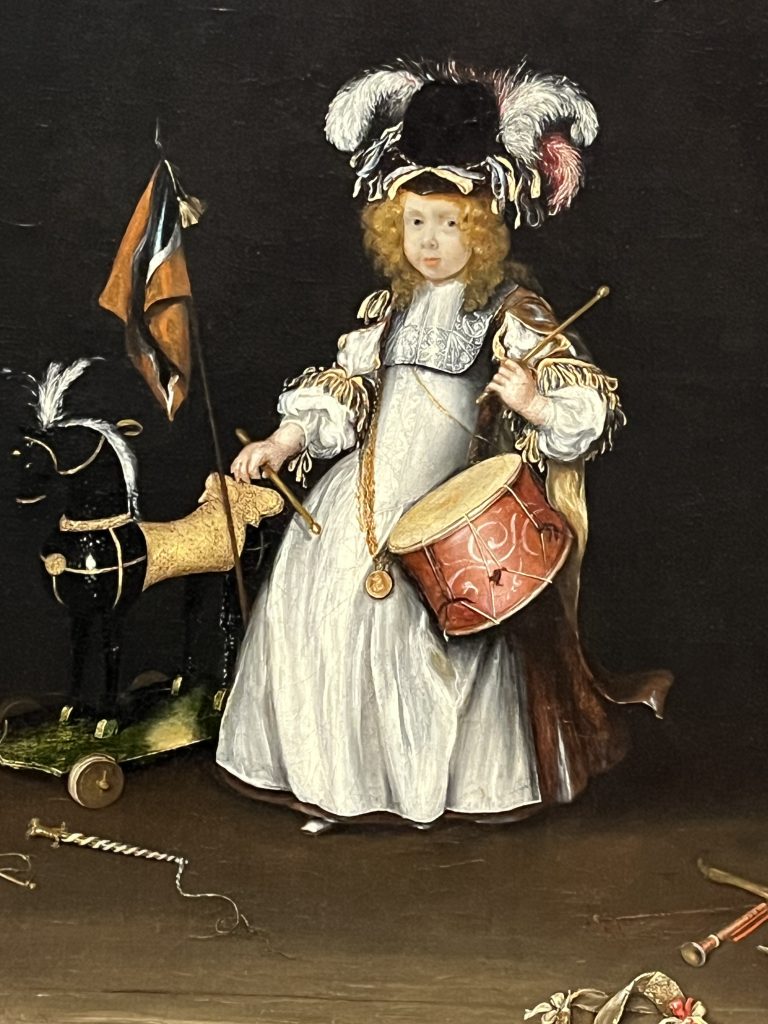Gesina ter Borch schilderde in 1667 in liefdevolle herinnering haar vroeg gestorven broer Moses als tweejarig kind met een hoed met strikken en pluimen, speelgoed verwijst naar zijn leven als soldaat.