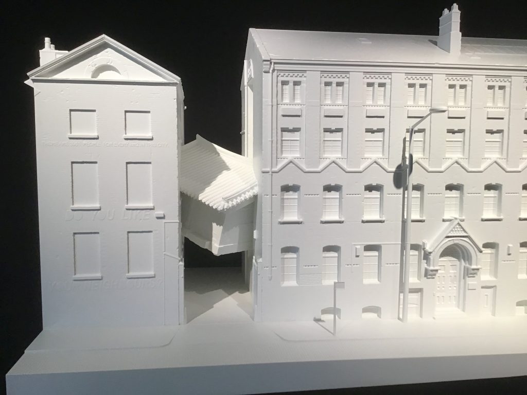 Dan is er 'Bridging Home': zijn ouderlijk huis als een brug ingebouwd tussen twee Victoriaanse gebouwen. Het project is in 2010 in het echt uitgevoerd voor de Liverpool Biennale in Duke Street. Hier is een maquette te zien.