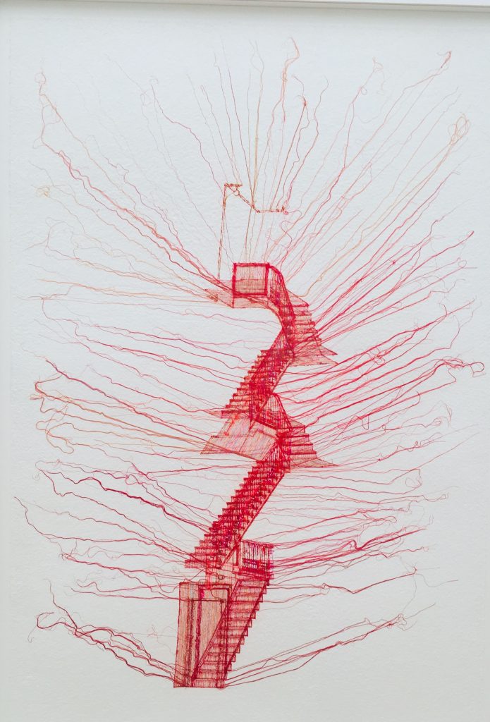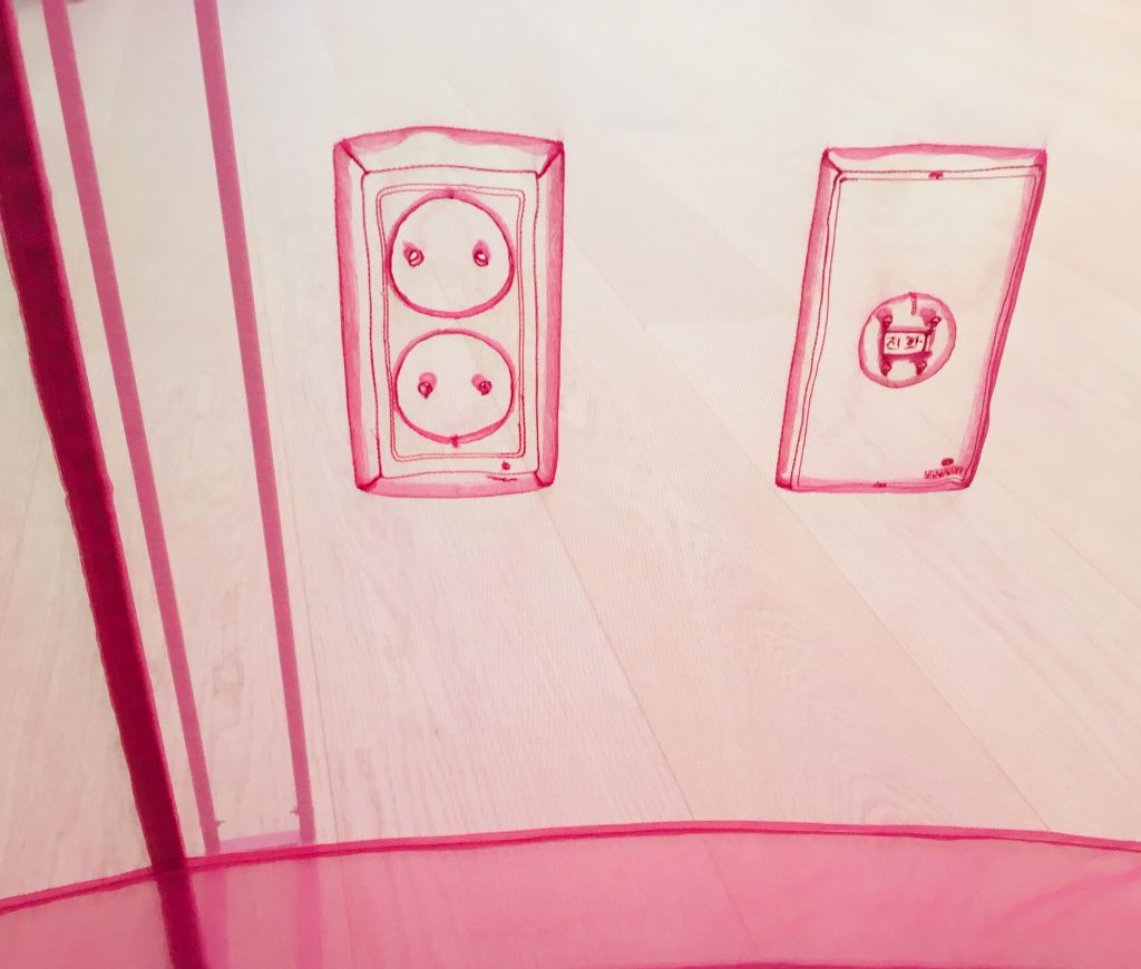 Mijn thuis voelt als een grote luxe, als je denkt aan wereldwijd al die miljoenen mensen on the move, in vluchtelingenkampen, krottenwijken en op straat. Mensen die op zoek naar een nieuw veilig thuis een rafelige tent moeten accepteren. Wij kunnen ons een thuis dromen in een huisje in de natuur, maar de werkelijkheid is vaak een wat onpersoonlijk appartementencomplex, een doorzonwoning in een Vinexwijk, of nog erger: een verzorgingshuis. Mooi dat een Koreaanse kunstenaar zo’n thema oppakt en met borduursels en werken van kleurig gaasdoek zulk bijzonder werk over maakt. Echt een belevenis.