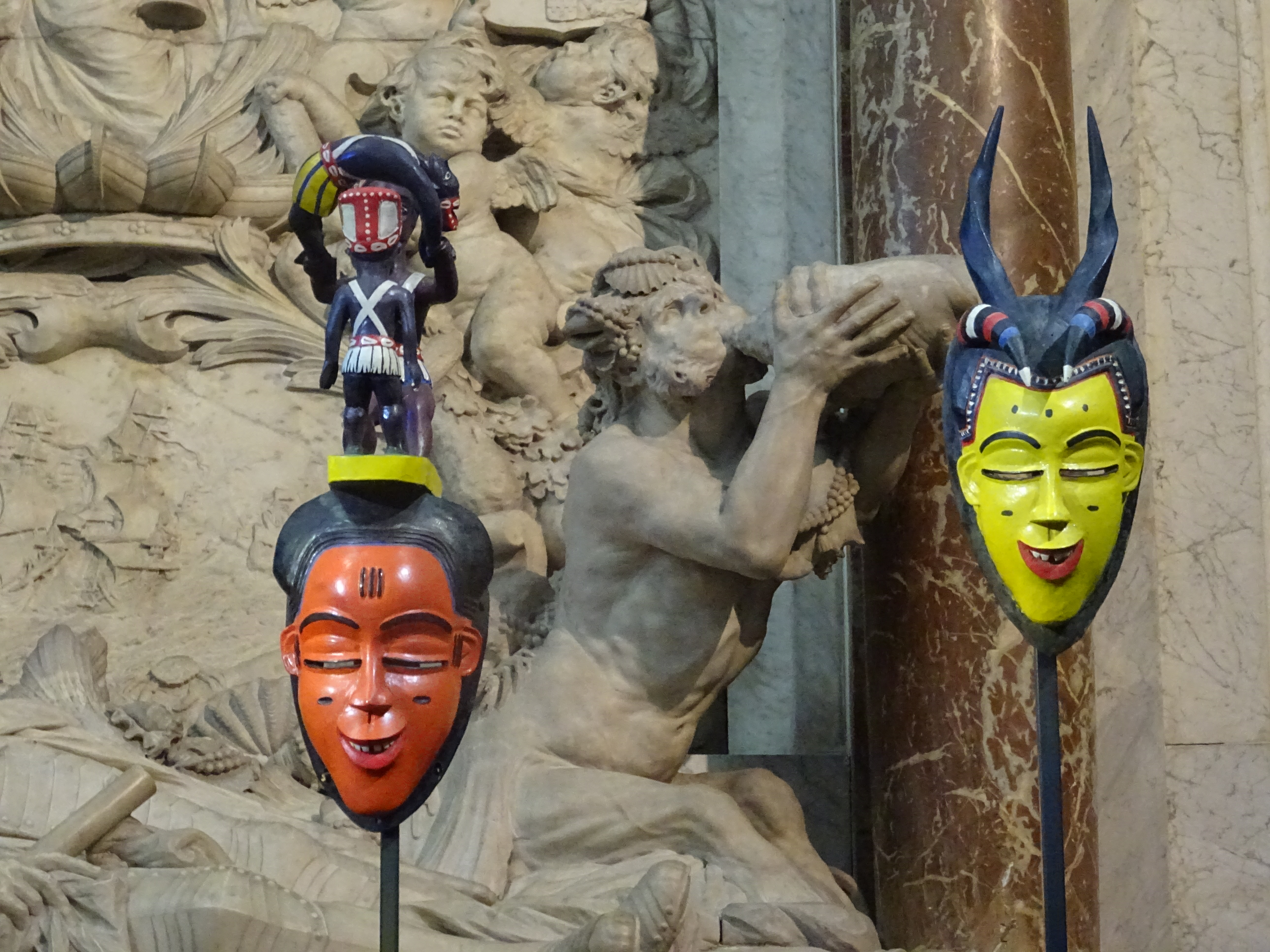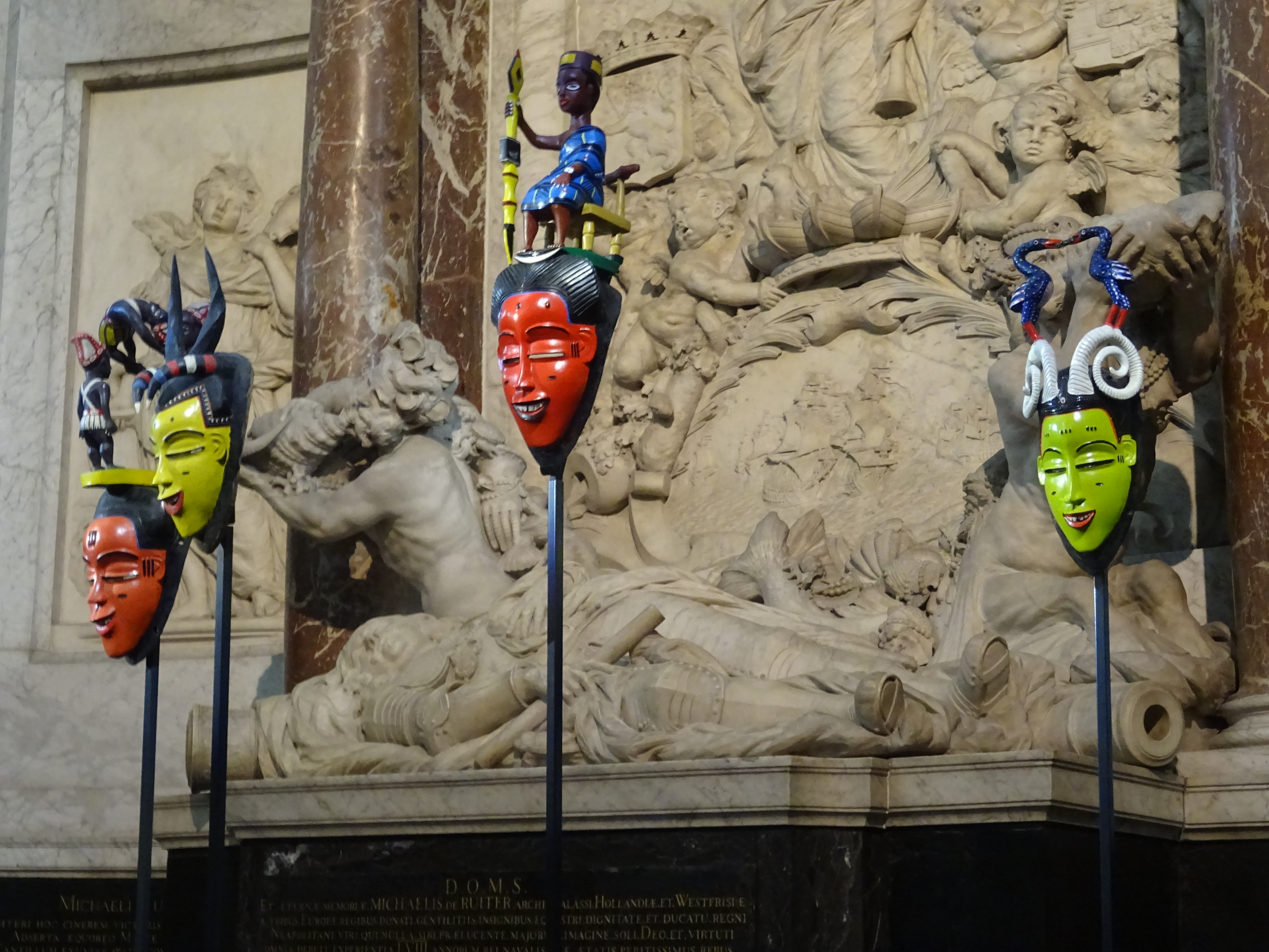 * Vier feestmaskers van Boti (ca. 1920 – 2013), in de tweede helft van de twintigste eeuw de beroemdste Guro-beeldhouwer van Ivoorkust, vrolijken tijdens de expositie Magisch Afrika in de Nieuwe Kerk het grafmonument van onze beroemdste zeeheld Michiel de Ruyter op. Prinses Beatrix opent de expositie vanavond, het Prins Claus Fonds is een van de sponsors.