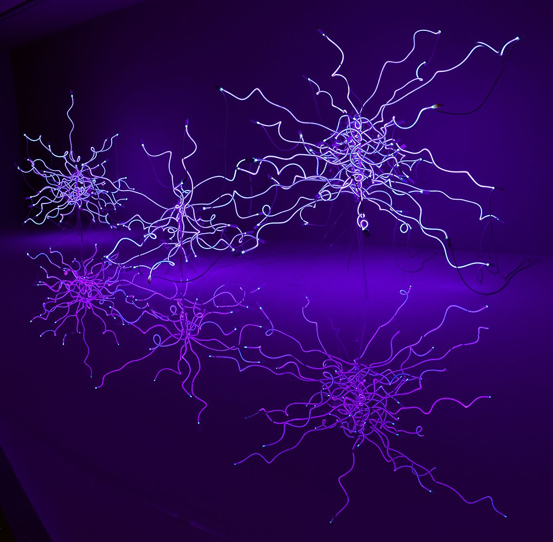 Sapphire Neon Tumbleweed, foto H. van Herk. Tumbleweed (jaren '70): neonsculpturen, opgesteld op een verhoogde refecterende perspex vloer.