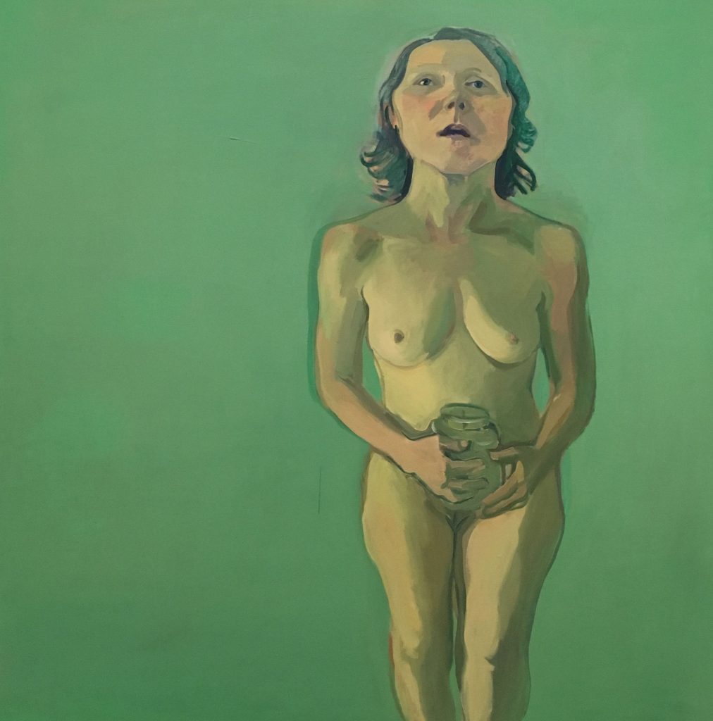 Honderden schilderijen van Lassnig hangen er nu in het Stedelijk. Ze zijn thematisch gegroepeerd: zelfportretten, sciencefiction, feminisme, verhouding tot mens, dier en techniek, visie op geweld en oorlog, de eenzaamheid en lichamelijke aftakeling in de laatste levensjaren. Het meest prangend, in het oog springend en overal afgebeeld, is 'Du oder ich' uit 2005. Toen ze dat maakte was ze al ver over de tachtig. We zien een afbeelding van een naakte oudere vrouw, wijdbeens, met twee pistolen: een op haar eigen hoofd gericht en een op de toeschouwer. Het schilderij zou een oproep zijn om goed naar haar kunst te kijken. Ook was ik getroffen door een beeld 'Zelfportret met augurkenpot’ (1971). Het staat zo dicht bij hoe een vrouw er werkelijk uitziet en zich voelt, het is zo krachtig van kleur.