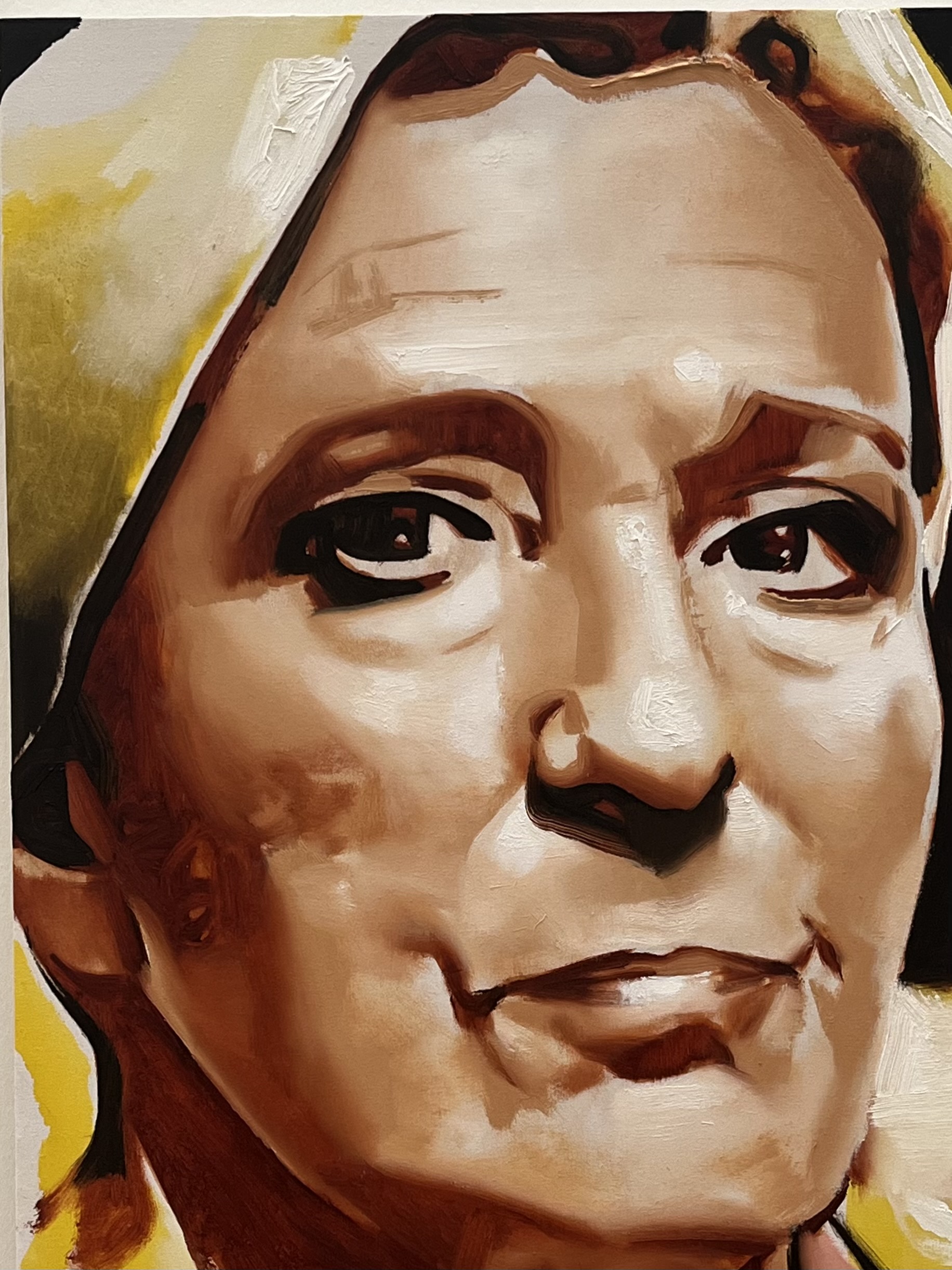 Op weg naar de uitgang van het Stedelijk Museum na het bekijken van de Stanley Brouwn-expositie was er een onverwachte ontmoeting met een vrouw die deze dagen vrijwel continue in het nieuws is. Was ze het écht? Ja, Marine Le Pen hangt in de IMC erezaal op de expositie 'Painting as prop' van Wilhelm Sasnal, kunstenaar uit Polen (1972, Tarnów). Sasnal verbeeldde zijn afkeer ragfijn raak. Le Pen: trap er vooral niet in Franse kiezer, ze draagt een masker dat een keiharde vrouw verhult. Naast haar de Hongaarse rechts-extremist Viktor Orbán, het soort man waarvan we in de wandelgangen zeggen dat hij een rotkop heeft.