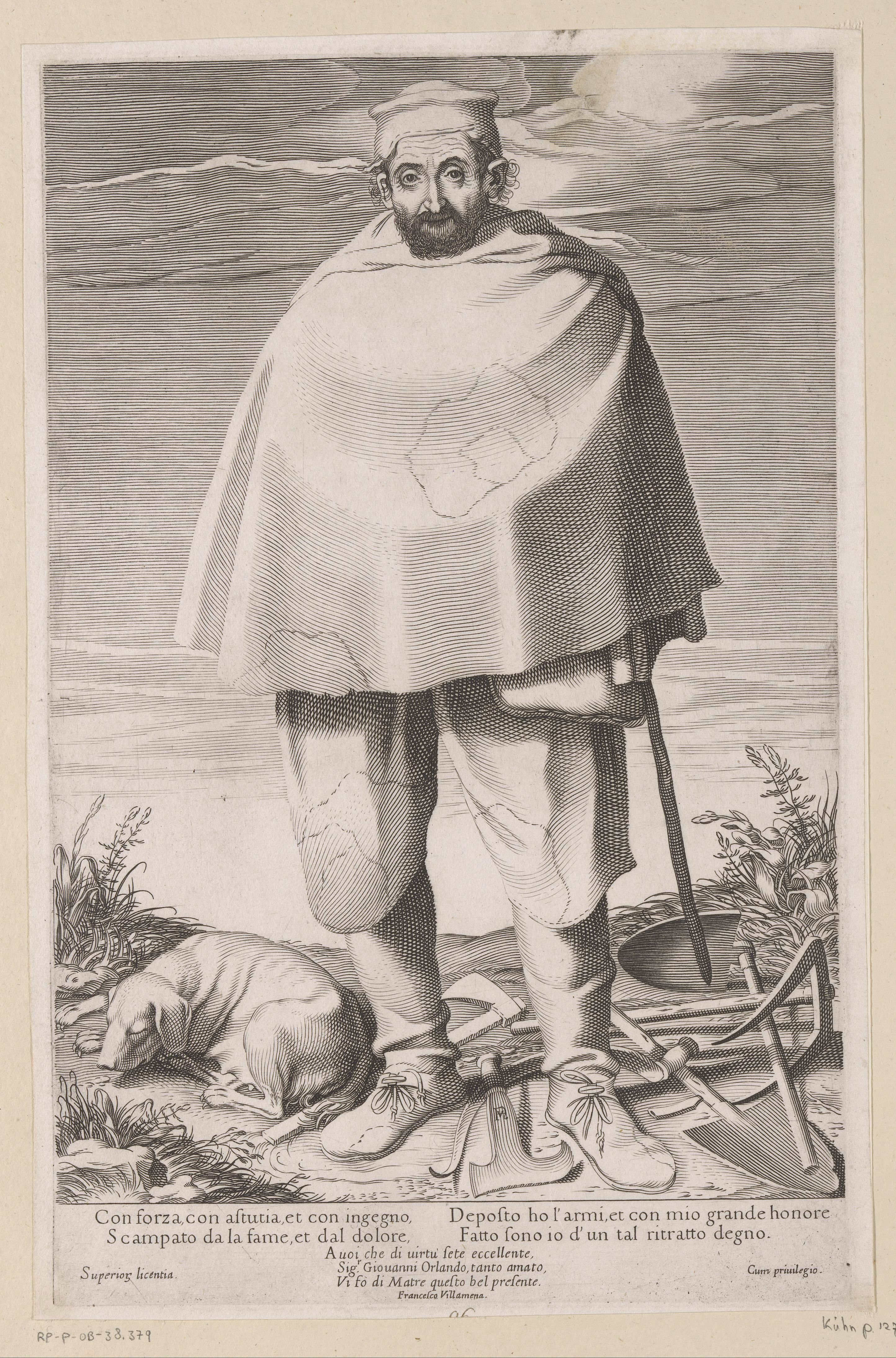 Het Rijksmuseum Amsterdam leende de gravure ‘Portret van een tuinman’ van Francesco Villamena (1576-1624) uit. Het was Giovanni Orlando, een tuinman in Rome, hier omringd door tuingereedschap waarvan we ook voorbeelden (zie de tweetand) op de expositie vinden. Hij ziet er intens tevreden uit, de tuiniers onder ons begrijpen vele eeuwen later precies waarom.
