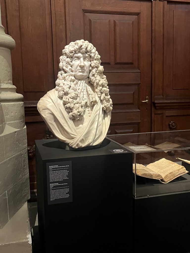 Wie was hij bijvoorbeeld, de deftig bepruikte 17de eeuwer die in marmer werd uitgebeeld door niemand minder dan Rombout Verhulst? Antonio Lopes Suasso verhuisde in 1635 van Bordeaux naar Amsterdam. In de Lage Landen keert hij terug naar het jodendom. Lopes Suasso, aldus het tekstbordje, wordt een belangrijke Sefardische koopman en bankier. Hij wordt rijk door strategisch te trouwen en internationaal handel te drijven in wol en diamanten. Rond 1675 verhuist hij naar Den Haag waar hij financier wordt van de Spaanse koning en stadhouder Willem III.