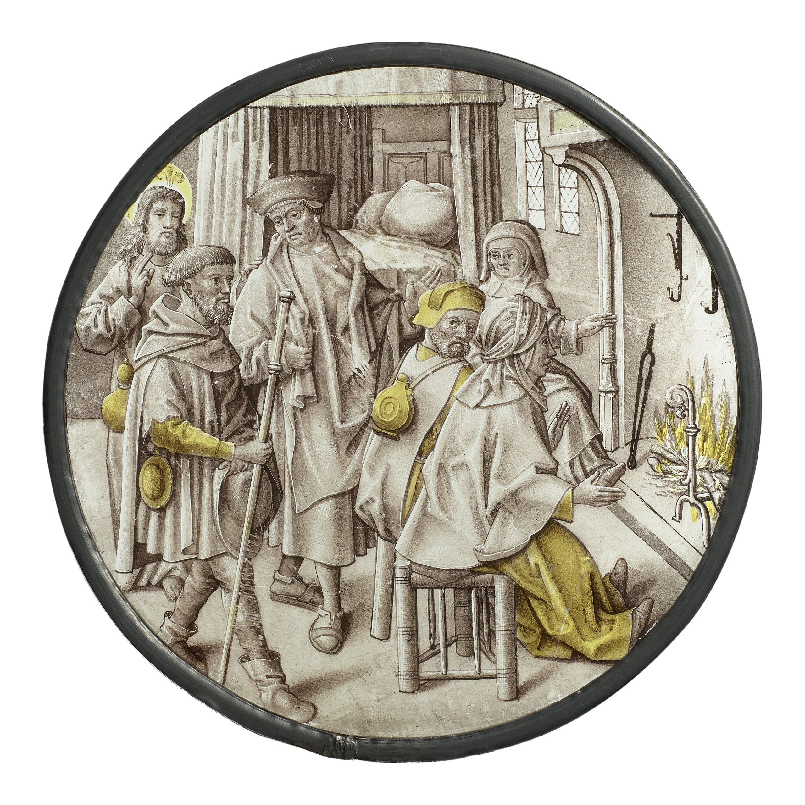 Anoniem, Het herbergen van de vreemdelingen. De werken van barmhartigheid, ca 1510-1520, gebrandschulderd glas,.De pelgrims te herkennen aan de pelgrimsstaf en fles op hun rug. Rijksmuseum, Amsterdam