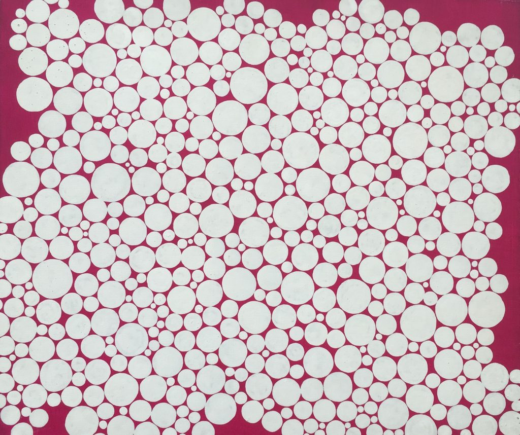 Het werk is vrolijk maar krijgt een wrange lading als je je realiseert dat het een manier is om haar angsten te controleren. Kusama lijdt onder andere aan horror vacui: een vrees voor lege ruimtes. Ze is bovendien geobsedeerd door het gegeven oneindigheid. Dat vertaalt zich in haar kunst in een herhaling van patronen. Ze werkt lange dagen door. In haar atelier of in haar kamer in het ziekenhuis.