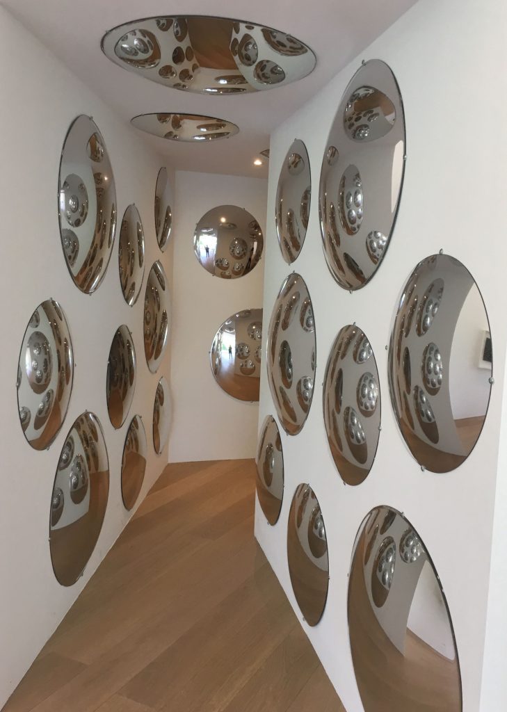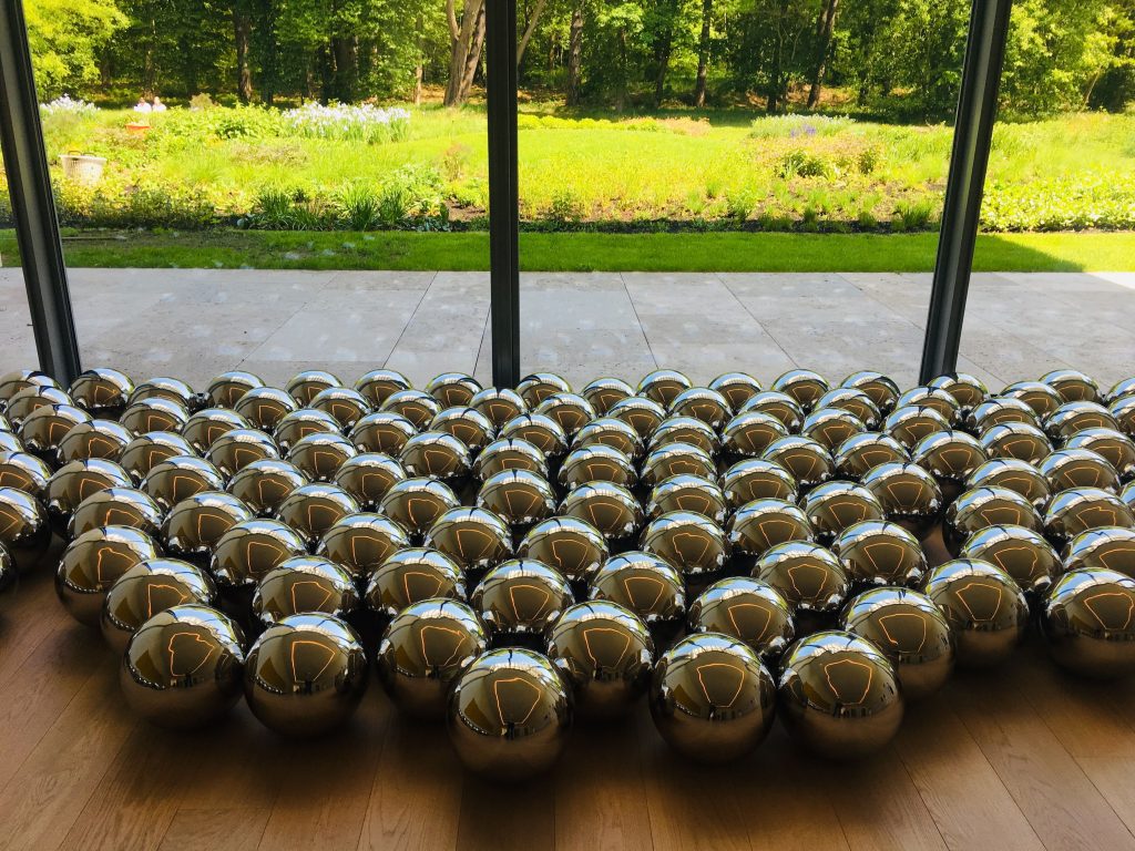 * In Museum Voorlinden, waar ik onlangs was vanwege de expositie van de Koreaanse kunstenaar Do Ho Suh, (zie https://www.museumkijker.nl/koreaan-do-ho-suh-in-museum-voorlinden-verkenningen-van-ruimte-en-thuis/ ), werd ik halverwege weggezogen naar de naastgelegen expositie van de Japanse beeldhouwster en installatiekunstenares Yayoi Kusama, die dit jaar negentig werd en nog steeds actief is. Haar werk, waarmee ze naam maakte in de jaren zestig en zeventig in New York, bestaat uit een kleurig universum met bollen, stippen en weerspiegelingen. Wellicht kent u haar spiegelzaal in Museum Boijmans Van Beuningen in Rotterdam, met duizenden rode stippen, fallussen en eindeloze spiegelingen.