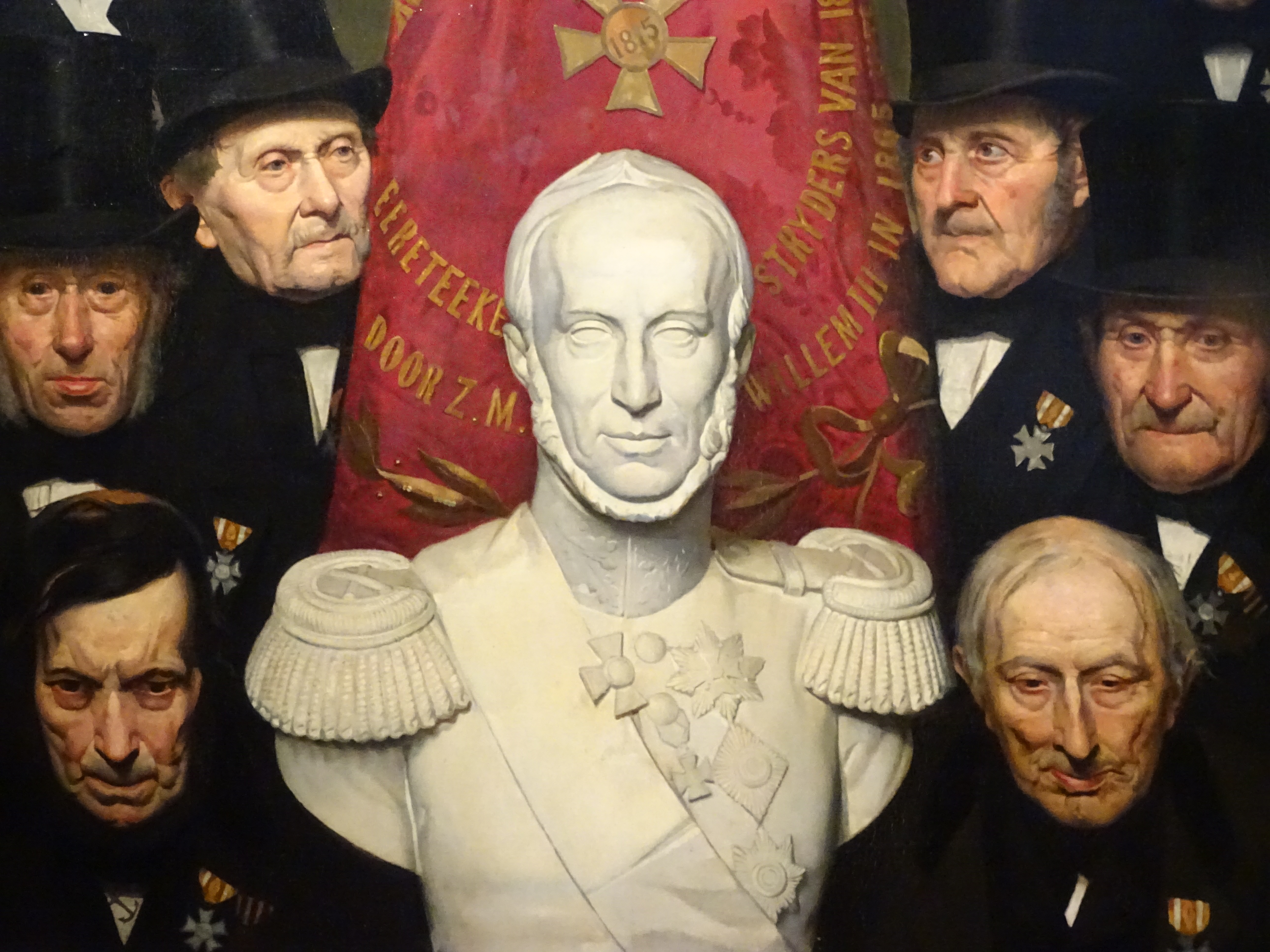 Petrus Marinus Slager maakte in 1875 voor de herdenking van Waterloo in Den Bosch een groepsportret met acht Nederlandse oud-strijders . Hij groepeerde hen rond een buste van Willem II en het vaandel van het genootschap het Zilveren Kruis. De Nederlandse veteranen moesten tot 1865 wachten voor ze met deze onderscheiding werden geërd. Een van de geportretteerden is de bet-bet-overgrootvader van D66-leider Alexander Pechtold, die bij de opening met een foto uit familiebezit in de hand probeerde vast te stellen wie precies. De man links onder? Wie weet, hij hoopt er ooit een keer zekerheid over te krijgen.