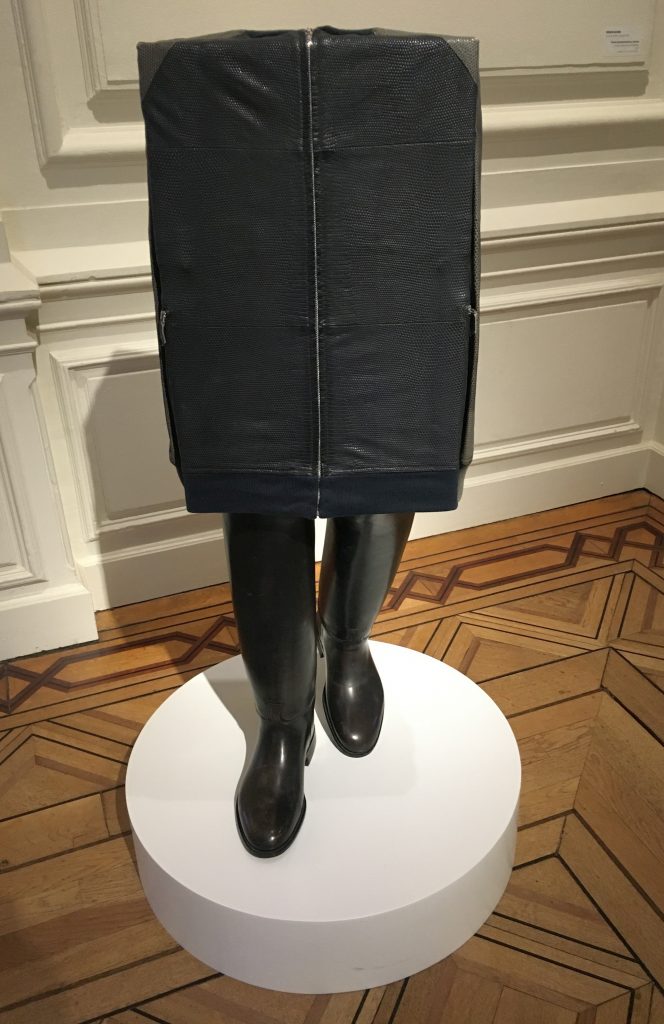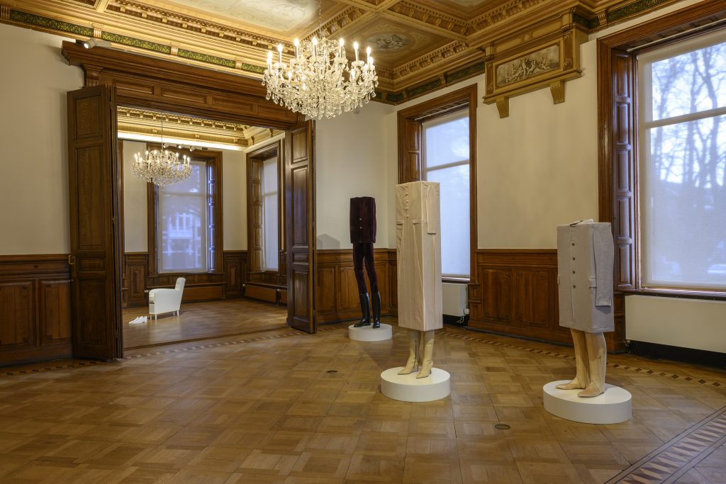 Bij het begin van de expositie stuit de bezoeker op een aantal menselijke figuren – voor zover die menselijk kunnen zijn zonder hoofd. Eerder zijn het aangeklede dozen. Keurig in het pak gestoken figuren, wandelende klerenkasten. ‘Kastenmänner’ noemt Wurm ze. Als je je voorstelt dat ze voortkomen uit herinneringen van een jongen aan de normatieve volwassenen uit zijn strenge patriarchale ouderwetse jeugd is het tamelijk beklemmend. Dezelfde beklemming spreekt ook uit de werken uit de serie ‘Narrow Furniture’, waarin levensgrote meubels en ander huisraad tot benauwende veel te smalle proporties zijn samengeperst. Een smal tweepersoons bed, een smalle fauteuil met pantoffels, een bad, een urinoir, een smalle telefoon… vaak van hagelwit kunststof. Een wonderlijke ervaring.