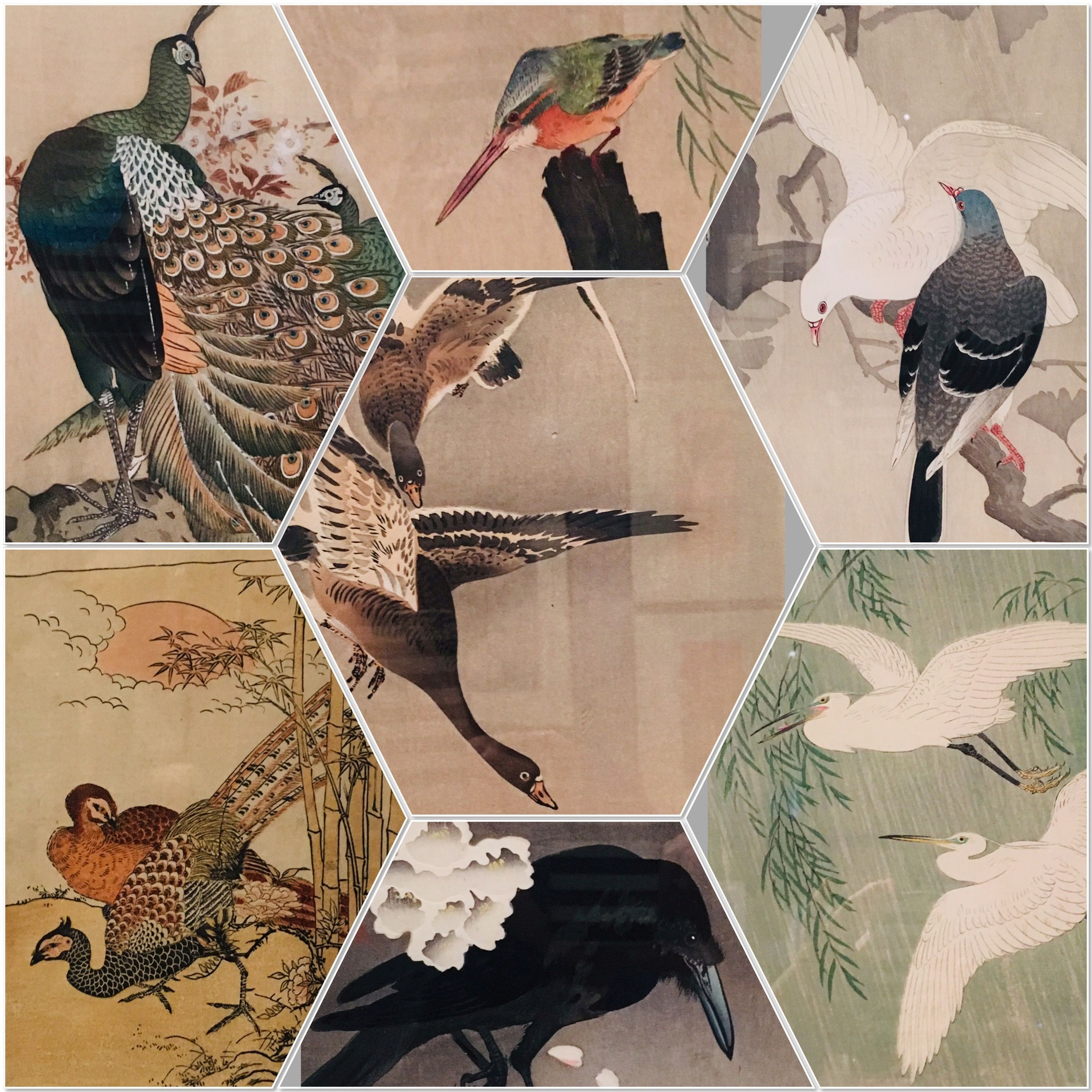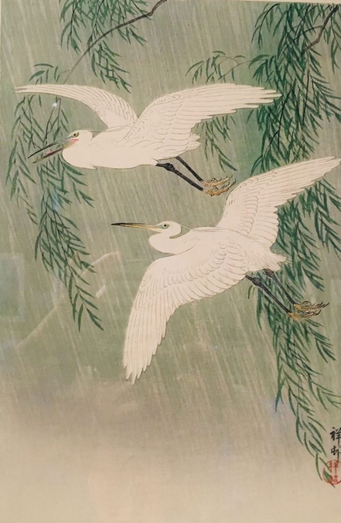 Van het werk van Ohara Koson werd ik het meest enthousiast. Bijzondere composities, bijzondere vogels. De spreeuw in de magnolia als voorbode van de lente, een reiger voor de maan, twee groene pauwen op de stam van een bloeiende kersenboom. Koson schildert de vogels vaak in barre weersomstandigheden: een watersnip in de regen, een groep witte reigers in de sneeuw, vliegende ganzen in een sneeuwlandschap, er is te veel om op te noemen. Ga er naar toe en geniet.