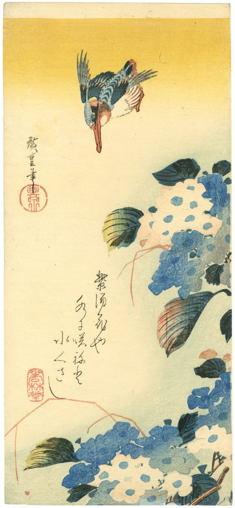 Van de 19e-eeuwse Utagawa Hiroshige en de 20e-eeuwse Ohara Koson hangen de meeste werken. Zij werkten voor uitgevers die de prenten in hoge oplagen lieten drukken en verkochten en werden daar wereldwijd beroemd mee. Hiroshige maakte smalle langwerpige prenten, vaak vergezeld van een haiku. Veel vogels vliegen tussen bloesems. Zijn onderwerpen hebben een grote symbolische betekenis. Zijn prenten zijn een en al grote vriendelijkheid, lieflijkheid en sierlijkheid. Hiroshige was bijzonder knap in het creëren van beweging: zijn zwaluwen lijken echt te fladderen om bij de bloemen van een perzikboom te komen.