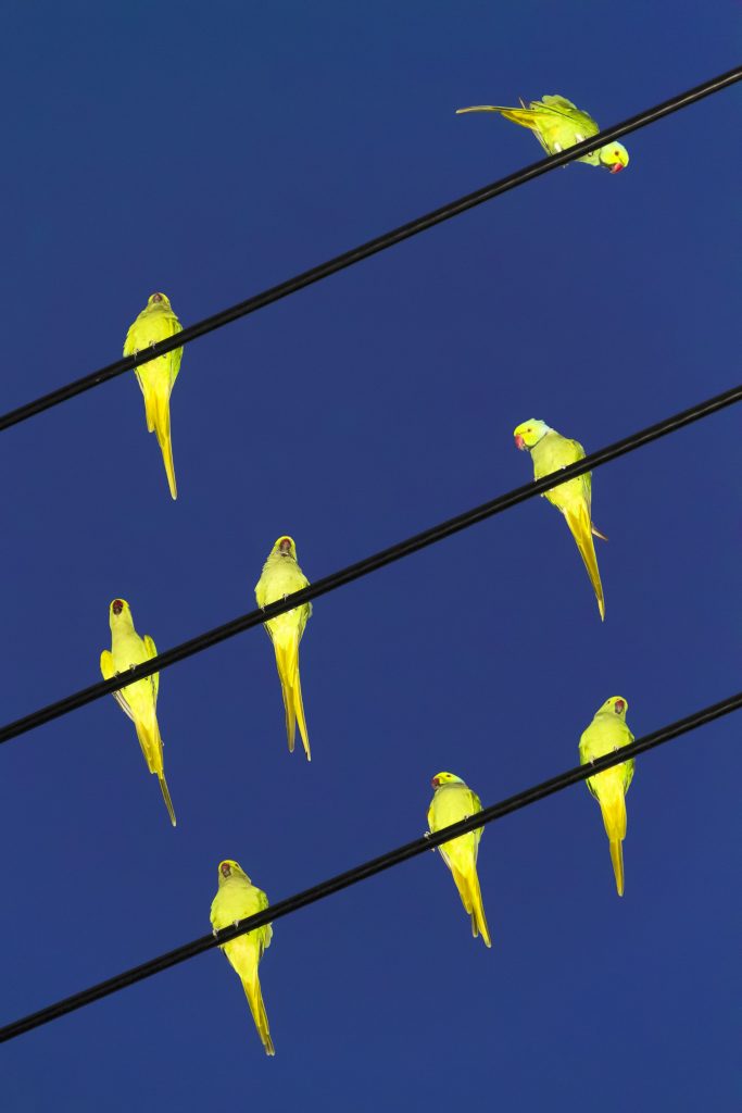 De tentoonstelling sluit af met schitterende foto’s van vogels in de stad van de hand van de hedendaagse fotograaf Mizutani Yoshinori (1987). Hij studeerde in 2012 af aan de Fotoacademie Tokyo en won al enkele prestigieuze prijzen. Twee series hangen er: 'The Birds' en 'Tokyo Parrots'. Parkieten en spreeuwen in bomen en op elektriciteitsdraden. Door de verstedelijking in Tokyo (en andere steden) raken vogels hun oorspronkelijke nestgebieden kwijt en gaan hun nesten in de stad bouwen. Door hun constante getjilp en vogelpoep worden ze een steeds grotere bron van overlast voor de stadsbewoners, maar het lukt de gemeentelijke instanties niet ze weg te krijgen. Prachtig geel tegen de strakblauwe lucht. Een prachtig beeld van de vitaliteit van deze vogels.