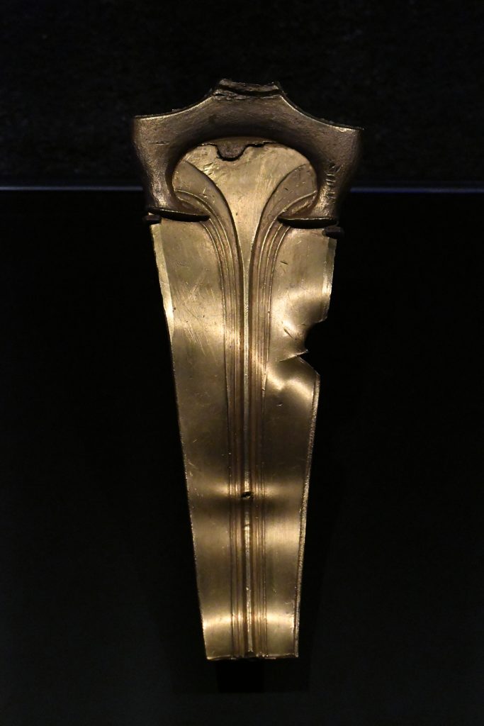 Eén van de fraaiste voorwerpen van de expositie is een gouden pronkhelm die helemaal versierd is met van binnenuit gedreven decoraties, afbeeldingen uit de mythologie. Andere figuurtjes zijn grotendeels cirkelvormig, mogelijk een verwijzing naar de zon die als een belangrijke god werd aanbeden. Aan de helm kleeft een wonderlijk verhaal: kinderen zouden het uiterst kostbare voorwerp hebben gevonden nadat de grond waarin het begraven was, door overvloedige regen was weggespoeld. Nadat ze er een poos mee hadden gespeeld namen ze de helm mee naar huis, waar het ding een tweede leven kreeg als drinkbak voor kleinvee, denk aan kippen. Vanwege het materiaal en de rijke versiering is moeilijk voor te stellen dat er zo achteloos mee is omgesprongen, al maakt het ontbreken van de bovenkant dat weer wel waarschijnlijk.