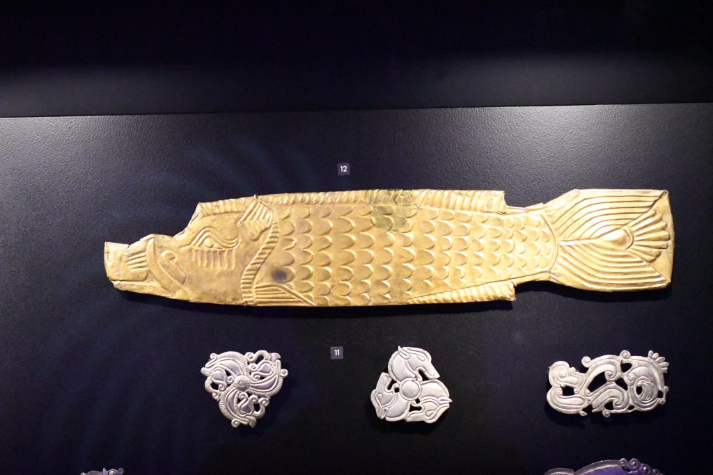 Ook wordt een drietal korte zwaarden van goud geëxposeerd, waardeloos materiaal voor een echt zwaard, want veel te zacht om er een flinke houw mee uit te delen, maar uiterst geschikt om respect te tonen aan al dan niet overleden koningen of andere hoogwaardigheidsbekleders.