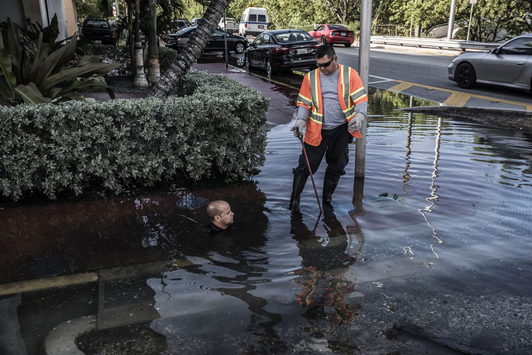 Kadir van Lohuizen / NOOR Rising seas Miami King tide at Miami beach, the water in the street comes over the poorly maintained seawall at Indian Creek and up through the drainage system. According to experts Miami can not be protected due to the fact that its build on limestone. Therefore it's believed that Miami beach and the Bay area need to be evacuated by 2060.