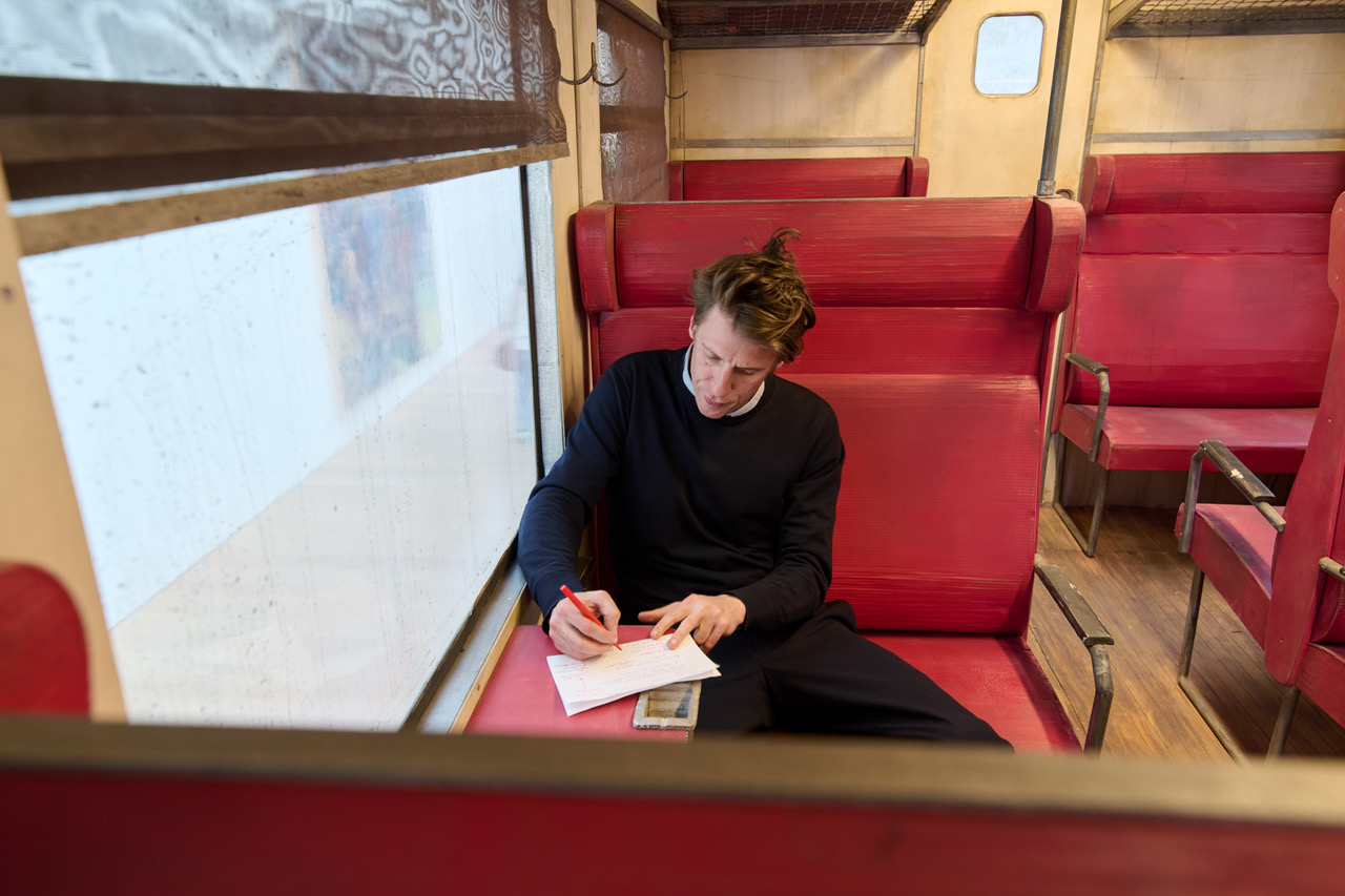 Feitelijk omvat de tentoonstelling omvat zeven zalen met een uitdrukkelijk thema. Zo is de zaal met als thema ‘Mythe’ gesymboliseerd door de slee van Beuys en is de woeste Mer du Nord nr 2.3 (2011-2013) olieverf en potlood op paneel van Thierry de Cordier te zien in zaal getiteld ‘en plein air’. Prachtige landschapstekeningen worden hier gecombineerd met een naar de waterlelies van Claude Monet verwijzende c-print getiteld Pont (2020) van Thomas Demand met daarvoor het keramische aandoenlijke miniatuur van Monet op het bruggetje in A summer at Giverny (2020) van Van de Velde zelf. Intrigerend in dezelfde zaal is de auto die geheel uit karton is vervaardigd. Knap gemaakt, zo bijna-echt. Het zijn dit soort objecten en installaties van Van de Velde die de beschouwer even helemaal opslokken en terugzetten in de tijd à la The Beanery van Edward Kienholz in het Stedelijk Museum. In een van de laatste zalen staat een al even spannende ouderwetse treincoupé. Ook van karton. Je mag en kan erin en ook dát is een ervaring terug in de tijd. Peuken in de asbakken, een pakje sigaretten van karton. Een jasje aan de haak, een walkman uit de jaren 80 en een hoed op het ouderwetse metalen bagagerek (van karton) boven de bank, een paraplu.