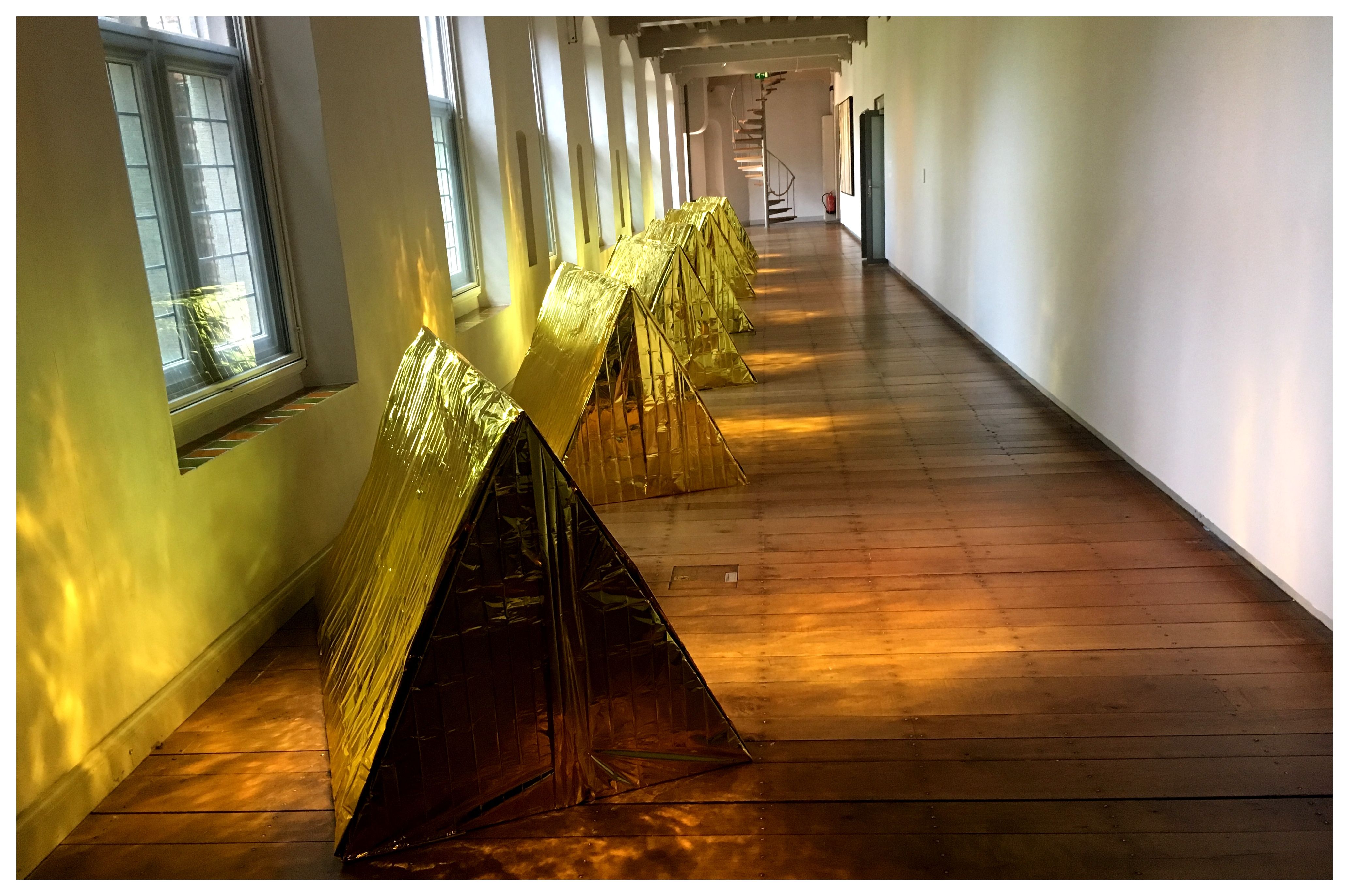 Het dichtst bij het thema 'Shelter' staat het werk 'Anti Drone Tent' van de Amserdamse kunstenaar Sarah van Sonsbeeck. Zes goudkleurige tenten staan in de kloostergang. Prachtig valt die gang binnen uit de binnentuin. De tenten glanzen je tegemoet. Ze zijn gemaakt van goudkleurig folie aluminium, materiaal dat we tegenwoordig associëren met reddingsdekens voor drenkelingen. Het roept beelden op van de duizenden tenten in honderden vluchtelingenkampen, overal in de wereld en zo weinig mogelijk bij ons in Europa, waar we liefst zo weinig mogelijk aan willen denken. Het is ongemakkelijk en bitter in dit mooie museum, want hoe veilig is de shelter daar. Wat zijn hun verhalen? Wat is hun perspectief?