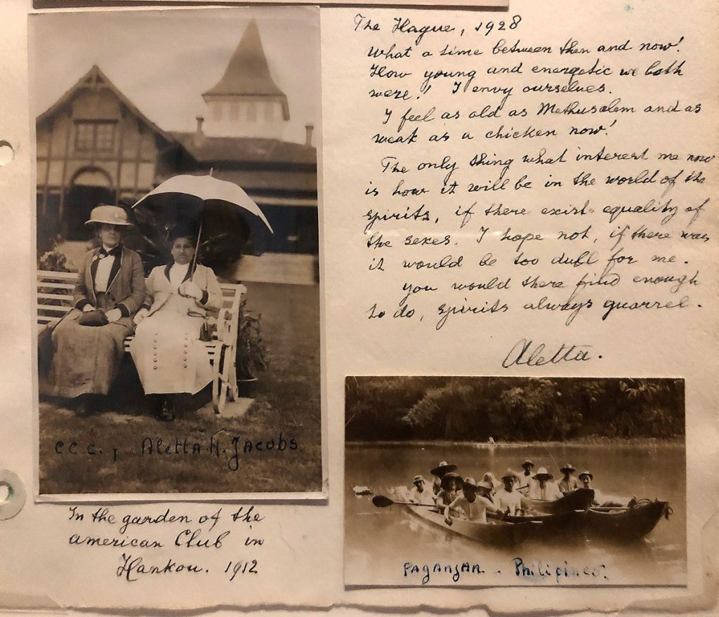 Dat politiek en actievoeren ook onlosmakelijk met het persoonlijke is verbonden, kun je zien op de wand met daarop een aantal albumbladen, verzameld door de Nederlandse pacifiste en activiste Rosa Manus voor de Amerikaanse Carrie Chapman Catt (1859-1947). Chapman Catt was een van de oprichters en eerste voorzitter van de International Women Suffrage Alliance. Voor haar 70e verjaardag maakten afdelingen vanuit de hele wereld albumbladen voor haar. Ze illustreren dat overal in de wereld actie werd gevoerd door vrouwenkiesrecht. Ontroerend vond ik de pagina die Aletta Jacobs voor haar strijdmakker maakte. Er staat een foto op van beide vrouwen (Carrie met een hoed als een hutkoffer, Aletta met parasol), volgens het bijschrift genomen in de tuin van de American club in Hankou (China) in 1912. Zestien jaar later schrijft Aletta Jacobs: