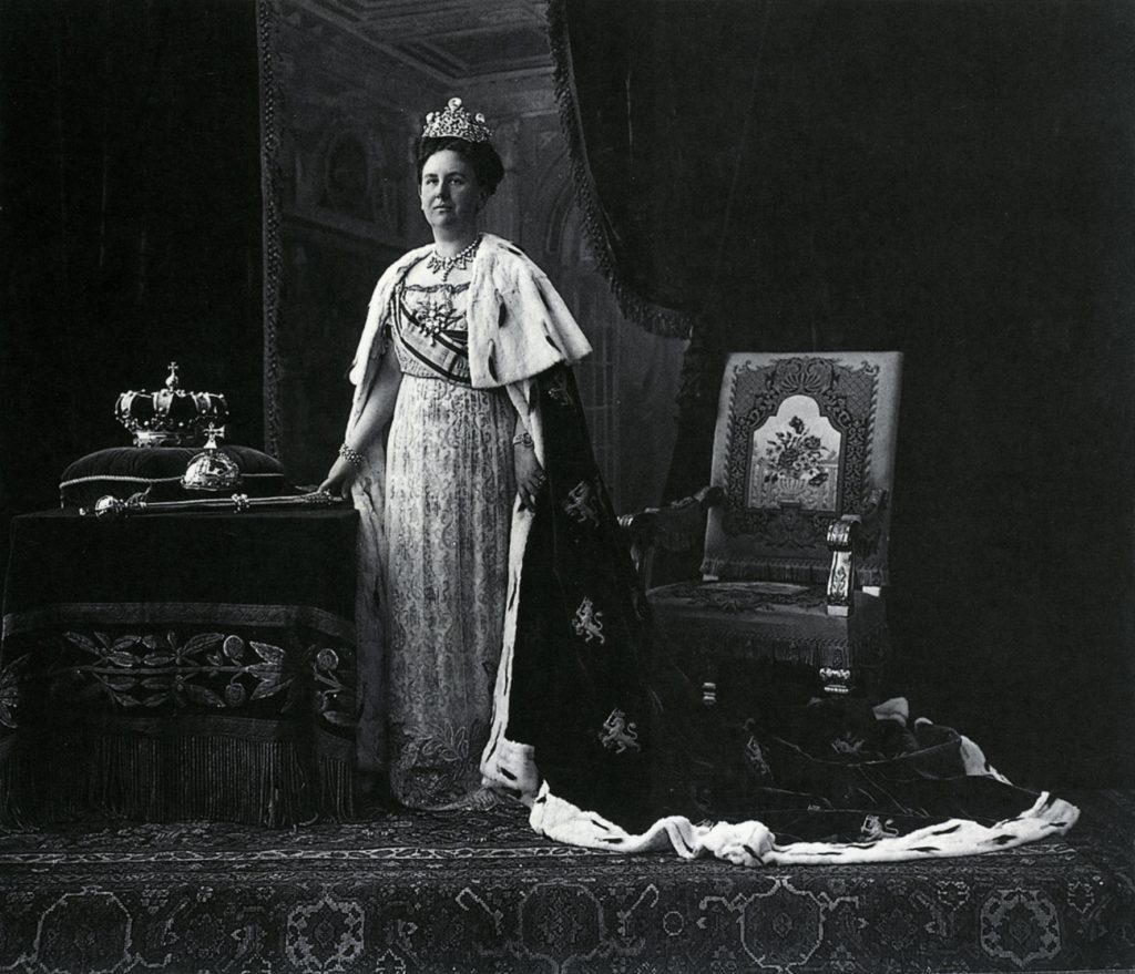 Staatsieportret koningin Wilhelmina met neo-empire galajurk met sleep, fotostudio Paleis Het Loo, 1912