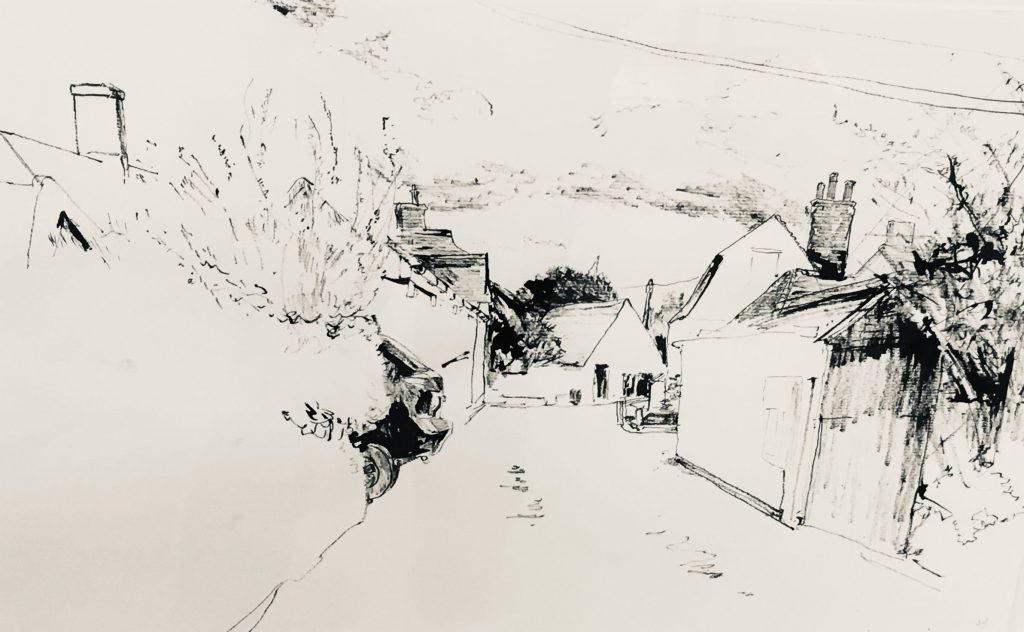 Maar er hangen ook landschappen, zoals de reeks 'East Bergholt' met Engelse landschappen, gemaakt voor het gelijknamige boek van schrijver Marcel Möring. Dat boek gaat over een onmogelijke liefdesgeschiedenis op reis in Constable County. De tekeningen zijn in rood afgedrukt in het boek. Op de tentoonstelling hangen de originelen in zwart-wit. De tekeningen zijn gemaakt met een luciferhoutje en inkt. Hij heeft van die landschappen alleen een deel van de achtergrond gedetailleerd getekend, de voorgrond blijft leeg. Het geeft een beeld van beweging, op reis zijn, verder weg is het, niet hier, het is een beetje een melancholiek desolaat gevoel. Heel mooi.