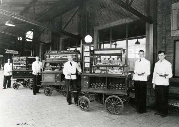 De meeste stationsrestauraties zijn helaas verdwenen, net als de restauratiewagons in de trein, hoewel de Duitse ICE's nog altijd een caféwagon hebben waar je simpele Currywurst en Warsteiner bier kunt krijgen. Het eten en drinken tijdens de treinreis heeft een lange geschiedenis. Toen in 1825 in Engeland de stoomlocomotief zijn eerste ritje maakte, werden de passagiers bij aankomst onthaald op hapjes en bier. In Nederland lag het eerste treinstation in Haarlem tegenover een herberg, in feite een voorloper van de latere stationsrestauraties. Lange tijd bleef eten en drinken buiten de treinen zelf, maar aan het einde van de negentiende eeuw kwamen er luxe restauratiewagens voor de eersteklas reizigers. In de eerste helft van de twintigste eeuw kwamen die er ook voor tweedeklasreizigers – de middenklasse.