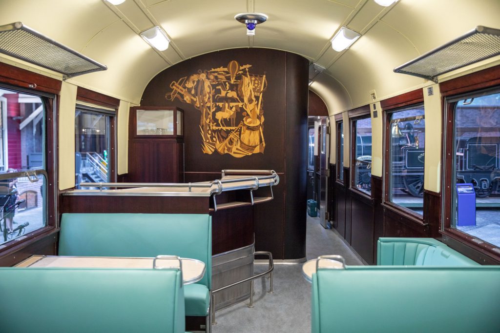 Restauratierijtuig Plan D uit 1951 is een waar icoon in de spoorgeschiedenis. De trein is helemaal vintage met zijn turquoise bankjes. Het is speciaal voor deze tentoonstelling gerestaureerd. Men kon er rustig dineren, maar er was ook een barretje en een koffietafeltje voor wie alleen maar wat wilde komen drinken.