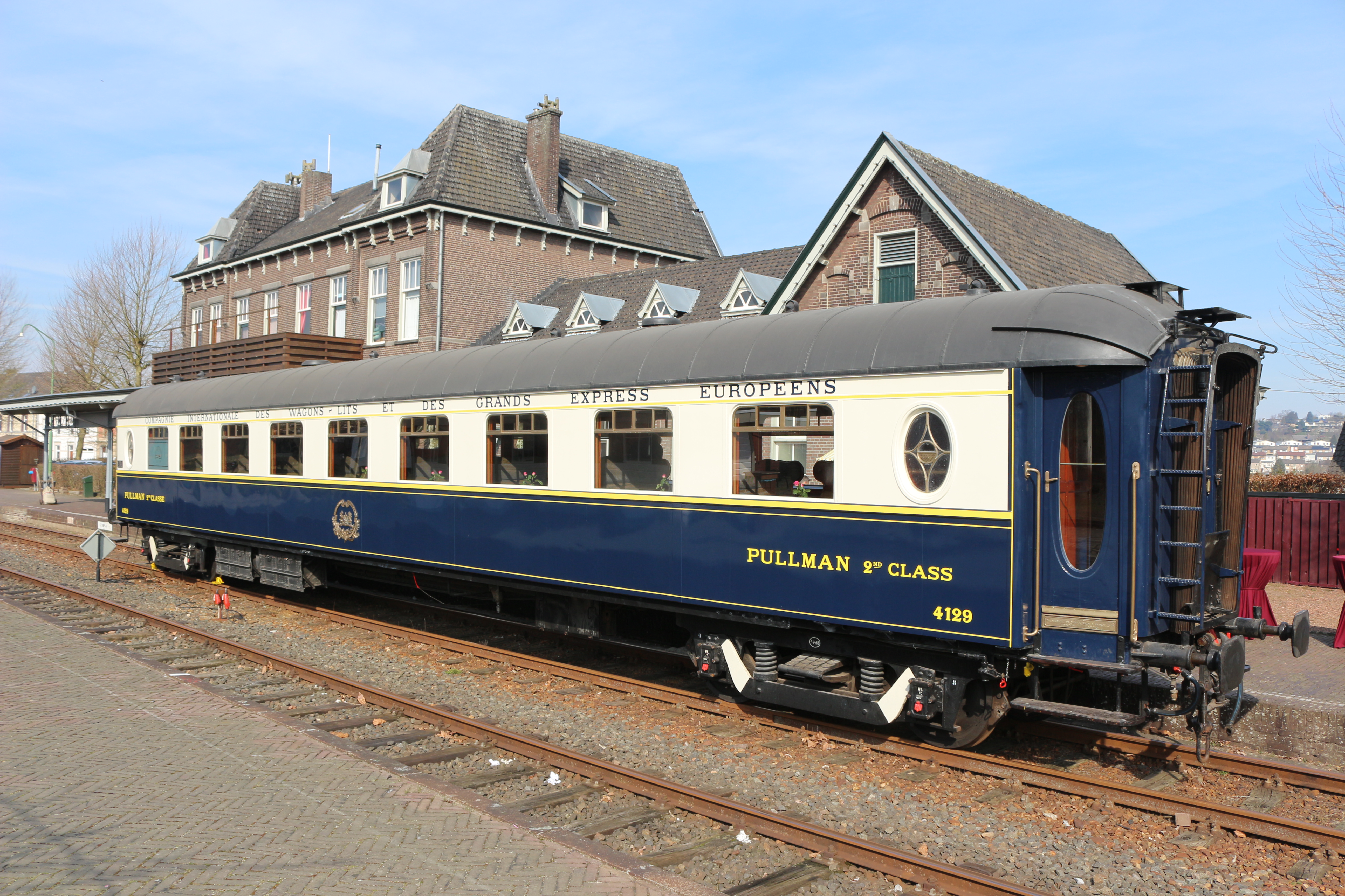 Ook staat er een blauw restauratierijtuig van Wagons-Lits uit 1943. Deze rijtuigen zag je veel in internationale treinen van de vorige eeuw. Ze waren eigendom van de Compagnie Internationale des Wagons-Lits, de ‘internationale slaapwagenmaatschappij’. Dat bedrijf leverde restauratie- en slaapwagens voor heel veel internationale trajecten. Aan boord kon je een meergangendiner krijgen, met soep vooraf, een hoofdgerecht met vlees en groente en een dessert.