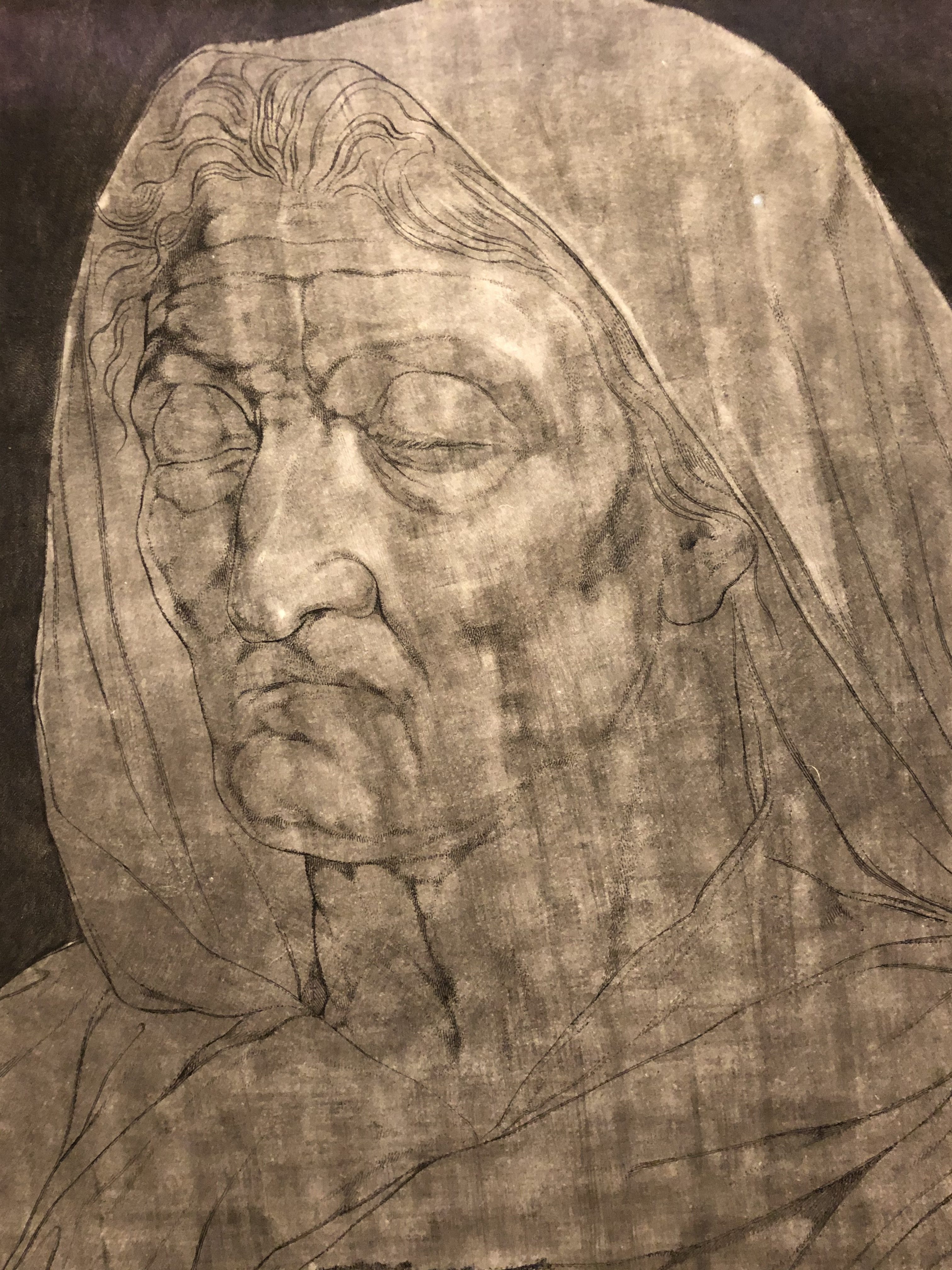Onder nog veel meer moois is ook ‘Oude vrouw met gesloten ogen’, een ets van Louis Joseph Masquelier (ca. 1790-1800). De kunstenaar paste volgens het tekstbordje een breed scala aan technieken toe: door de witte hooglichten in haar gezicht lijkt de onbekende vrouw op een gebeeldhouwd reliëf, een Romeinse portretbuste of een camee. Dank aan Waller én de beheerders van zijn fonds.