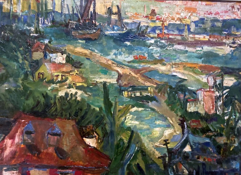 Het schilderij ‘Nieuwe Haven. Gezien vanaf Parera’ (1956) is een beeld van de Nieuwe Havenweg, een belangrijke verkeersader die werd aangelegd voor de komst van de Shell olieraffinaderij. De komst en groei van Shell veranderde Curaçao onomkeerbaar en beschouwde zij als een ecologische nachtmerrie voor het eiland. Perlmans keuze voor dit onderwerp is veelzeggend. Door een infrastructuurproject van Shell te tonen bracht ze de toen heersende koloniale verhoudingen in beeld. De werken in deze periode imponeren door hun verbeeldingskracht en fantasie, een indringende symfonie van kleur en vorm.